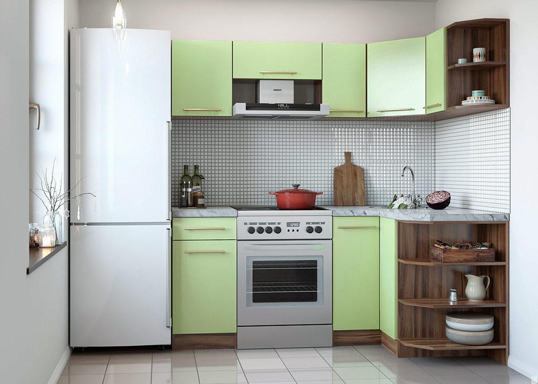 Les armoires supérieures et inférieures ne sont pas les seules choses sur le mur de la cuisine qui peuvent être installées dans le coin. Malgré la lourdeur apparente, ils peuvent mettre des appareils de cuisine. Par exemple, une plaque de cuisson ou un poêle avec une hotte de ventilation. Le coin est un endroit merveilleux pour un grand réfrigérateur encombrant. Le réfrigérateur est installé en demi-cercle, offrant un accès correct au contenu. À droite du réfrigérateur, il est préférable de fournir une surface de travail et des armoires qu'un poêle.