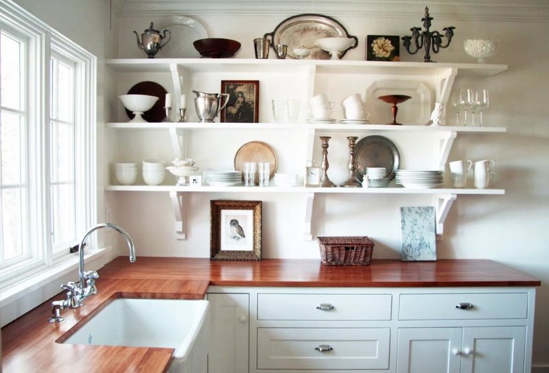 Les étagères ouvertes avec des plats apparents sont parfaites pour une cuisine rustique