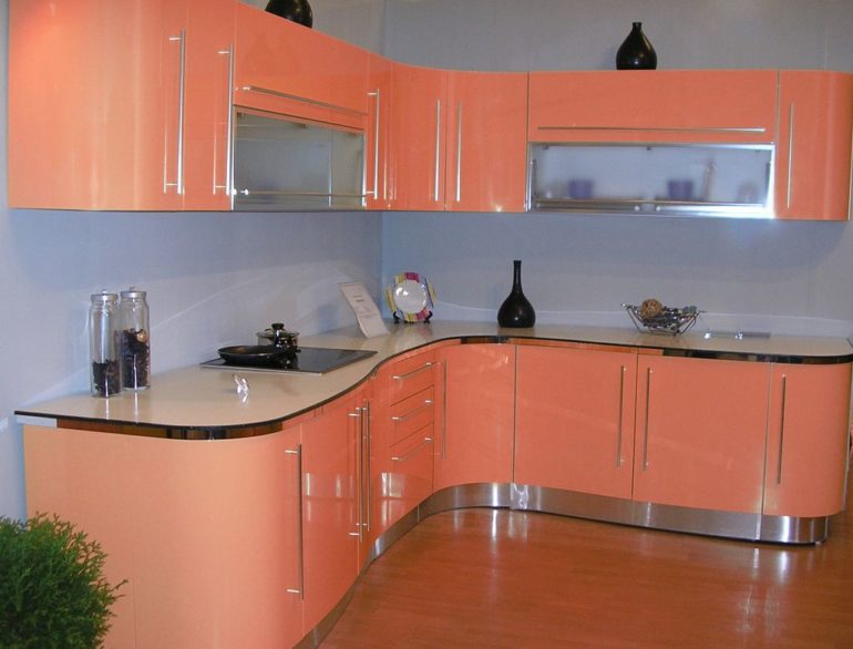 Les armoires sur mesure avec des étagères en forme de tarte sont l'une des options pour créer un coin plus efficace de votre cuisine. Avec les étagères rotatives en forme de tarte, vous devrez créer un système de traction créatif dans le placard ou utiliser des tiges doubles - une de chaque côté de la structure. Ce projet vous permet d'avoir accès aux coins les plus reculés, là où la maîtresse de la cuisine ne peut généralement pas se rendre, ayant les étagères fixes habituelles.