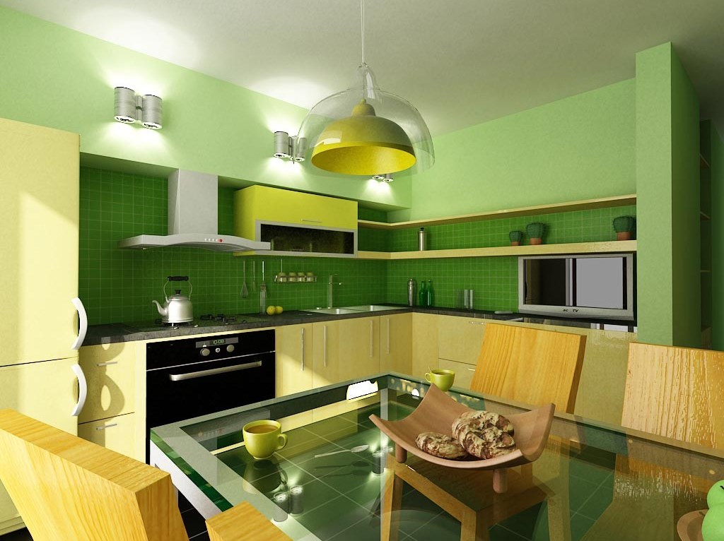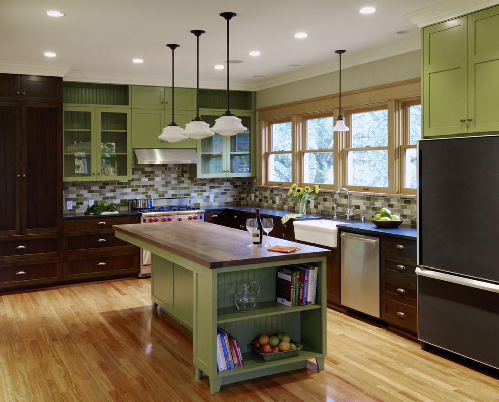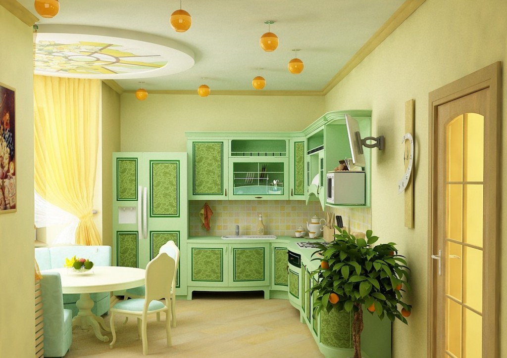 Le vert évoque l'été: herbe tondue, soleil brûlant, mer de toutes sortes de verdure. Aimé par beaucoup de gens pour leur influence sur la psyché humaine. En le voyant, une personne se calme, la psyché se normalise. Tout le monde aime la nature à laquelle il est associé. Après une dure journée de travail au milieu du bruit et de l'électronique, le vert se tonifie parfaitement, ressemblant à une poussée de force après un jus de fruits frais ou un jus de fruits fraîchement pressé. Dans la cuisine dans cette couleur règne le confort et le confort, complétant les dîners et les réunions de famille autour d'une tasse de thé. Le vert a de nombreuses nuances: du vert clair à l'émeraude sombre. Toute personne pourra choisir pour elle-même une couleur adaptée à son goût.