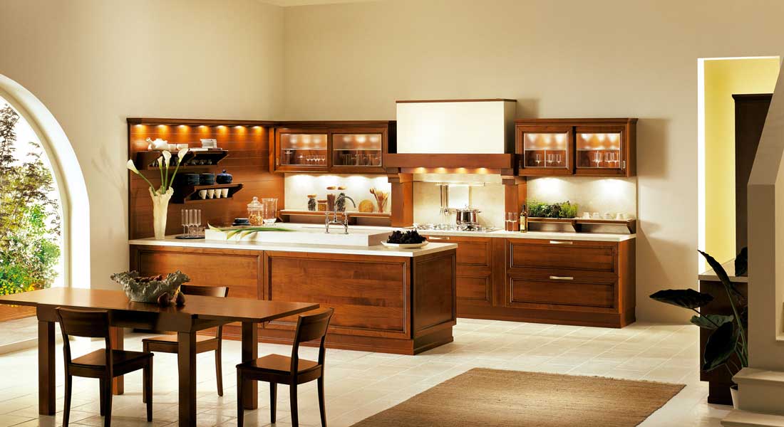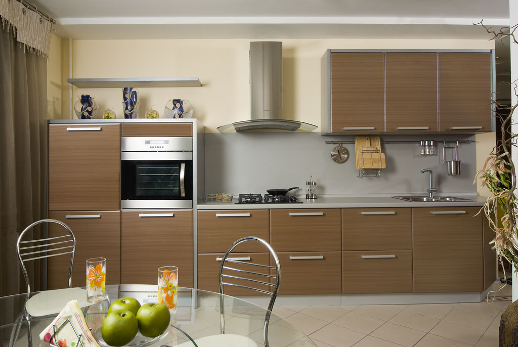 Surtout dans la conception du brun, il y a un arbre. Toutes sortes d'armoires suspendues, tables, chaises, revêtements de sol - sont faites de bois de différents types et couleurs. Il n'y a pas deux types de bois différents de la même couleur, ce qui donne la possibilité de donner des tons différents à la cuisine, mais vous pouvez vous limiter à un seul, en ajoutant une image de solidité. En variant la saturation, vous pouvez changer l'ambiance de la cuisine. Les nuances claires ajoutent légèreté et sophistication. Les tons profonds conviennent aux personnes sérieuses et affirmées.