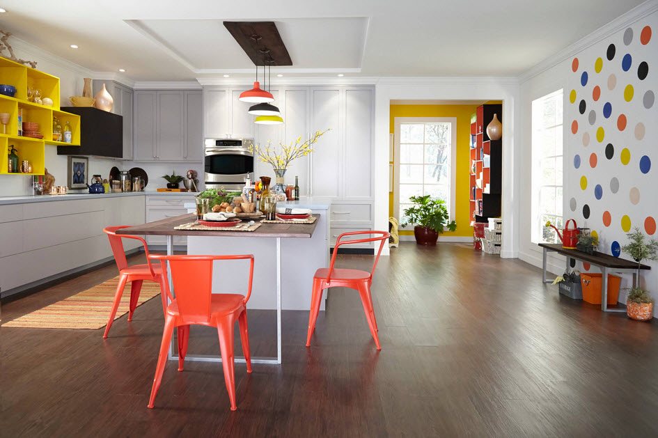 Les principaux éléments de base du jeu de couleurs de la cuisine sont la couleur du sol, des murs et de la cuisine. Ce sont ces couleurs qui prévaudront à l'intérieur et, très probablement, seront naturelles et proches les unes des autres. Vous pouvez ajouter seulement quelques nuances supplémentaires lumineuses, et l'intérieur sera très différent, plus élégant et plus beau.