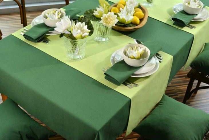 On trouve la taille optimale. Pour une perception harmonieuse de la vaisselle et de l'apparence de la table, il est habituel que les bords de la nappe tombent d'environ 20-25 cm, ce qui signifie que la longueur et la largeur de la toile ne doivent pas dépasser la taille du dessus de table de 30 cm maximum, mais pas moins de 15 cm. Sinon, la nappe sera trop court.