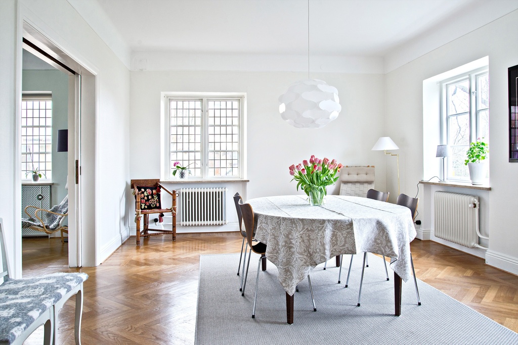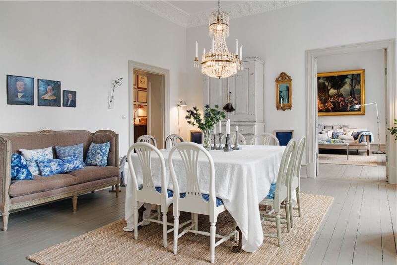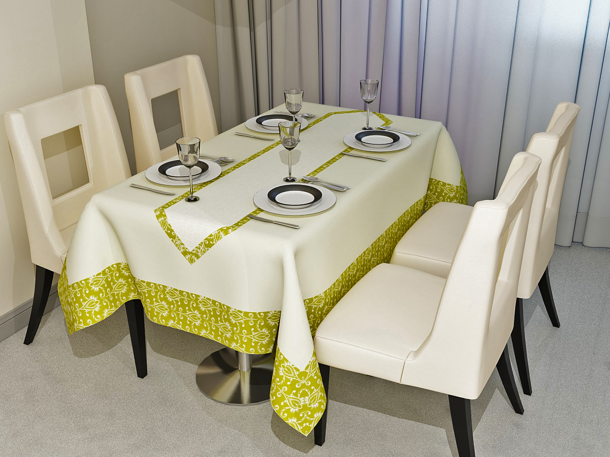 Ne recouvrez pas la table avec des tissus au sol, et encore plus combinez-les avec des housses de chaise, tout le look de la salle à manger est perdu et vous obtenez la sensation d'un café ou d'un restaurant. De plus, les longueurs de plancher ne sont pas sûres pour les petits enfants.