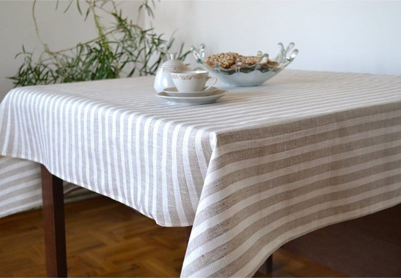 Lin (matière écologique naturelle). Les nappes en lin complètent parfaitement n'importe quelle cuisine, ont une texture dense et une résistance relative à la pollution, coulent parfaitement, soulignent la présentabilité des plats sur la table et ont une résistance accrue.