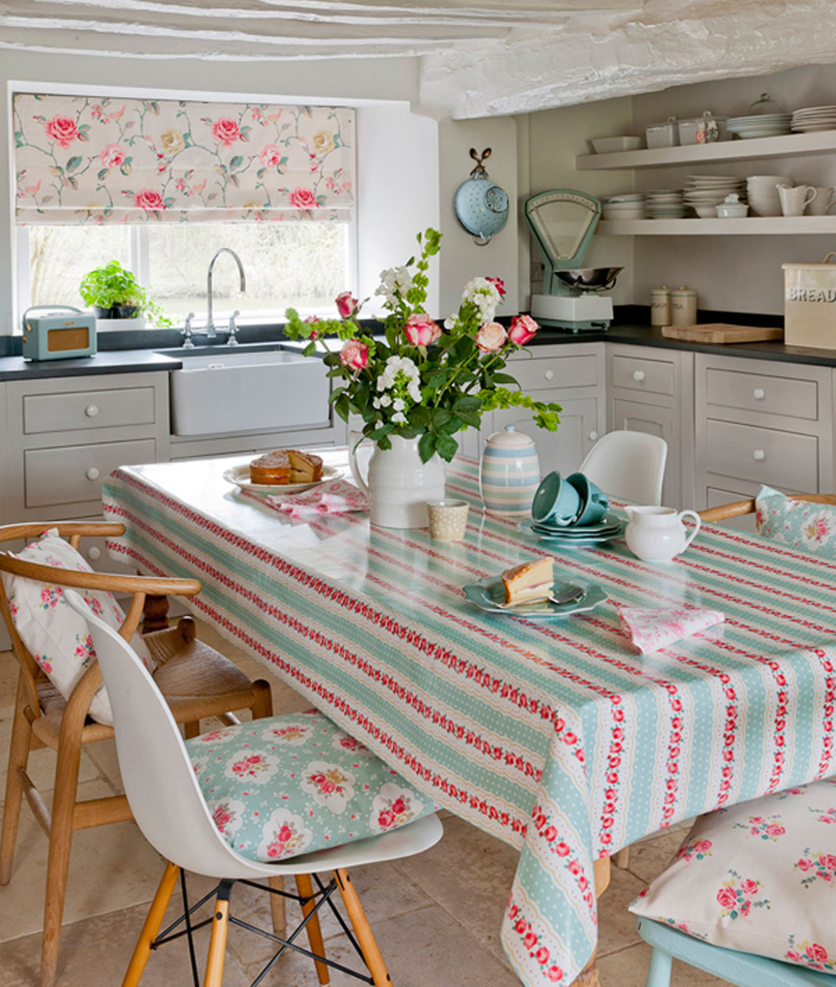 Nappe à imprimé floral à l'intérieur d'une cuisine de style provençal