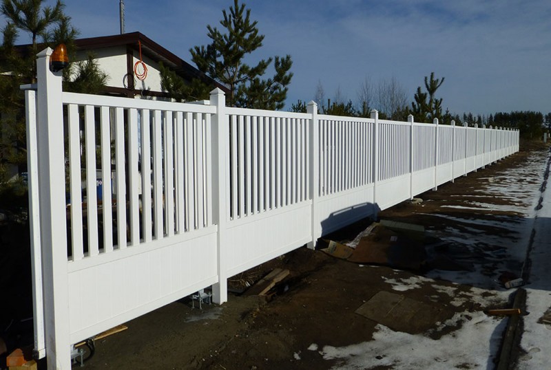 - Examen limité. Ces clôtures sont installées avec une toile continue, qui protège les propriétaires des regards indiscrets autant que possible. Les structures sont installées sur une fondation solide, en brique, en pierre ou en bois et entourent de grandes surfaces.