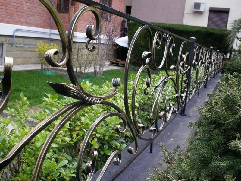 - Dessins forgés. Les sections métalliques estampées en métal avec des éléments décoratifs sont l'option la plus abordable, le coût d'une telle clôture dépend de la complexité des ornements.Les plus beaux spécimens sont créés à partir de métal forgé à chaud, ce qui vous permet de donner au matériau toute forme. Des sections forgées sont souvent installées entre des piliers en brique ou en pierre.