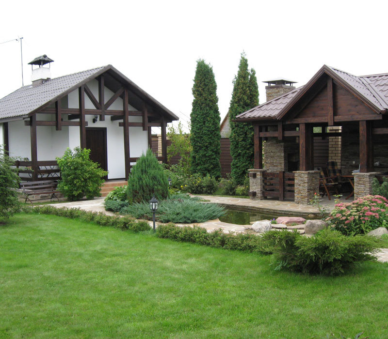 Aménagement d'un chalet d'été avec une petite maison, des dépendances et une aire de loisirs