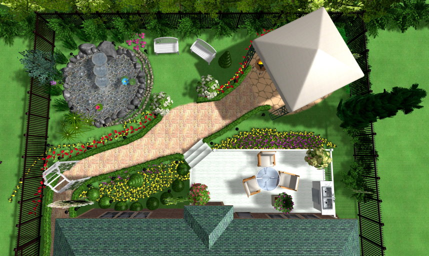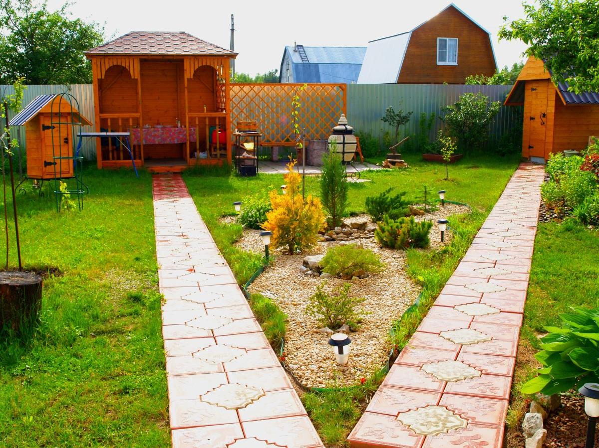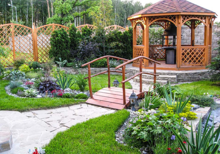 Assurez-vous de laisser un espace nu sur lequel rien ne poussera, sauf la pelouse. Il servira de terrain de jeu pour divers jeux ou de salle à manger. N'oubliez pas non plus les enfants. Ils doivent équiper une aire de jeux d'une balançoire, d'un bac à sable. À proximité, il y a souvent un kiosque, utilisé pour les réunions avec la famille, les amis, les voisins le soir.