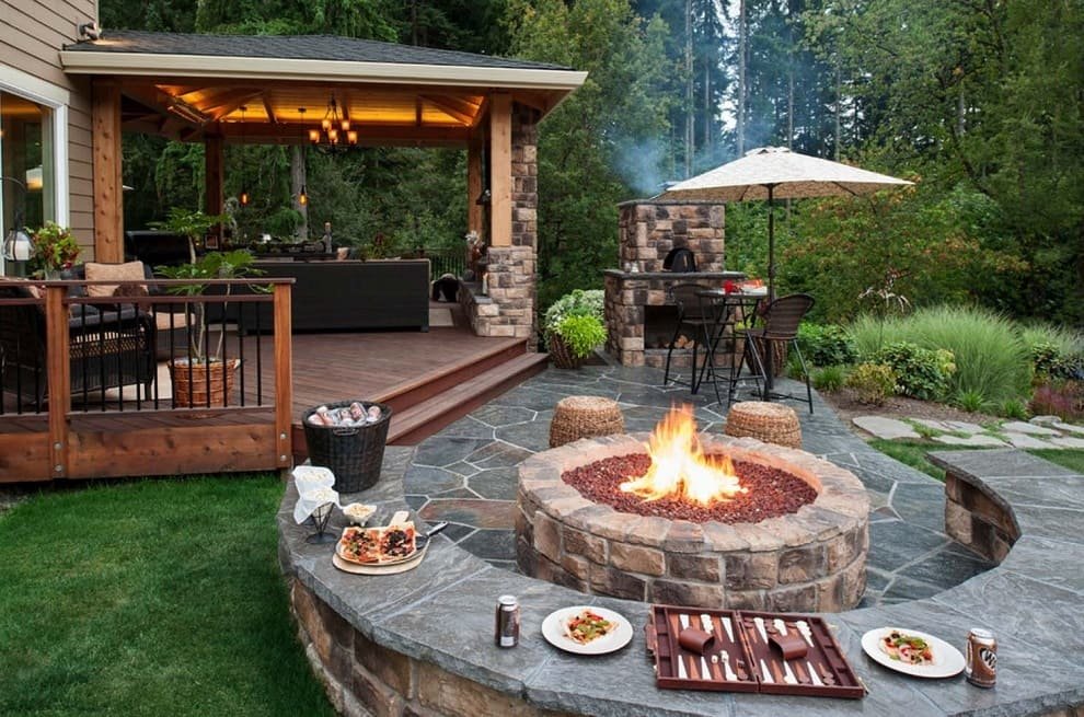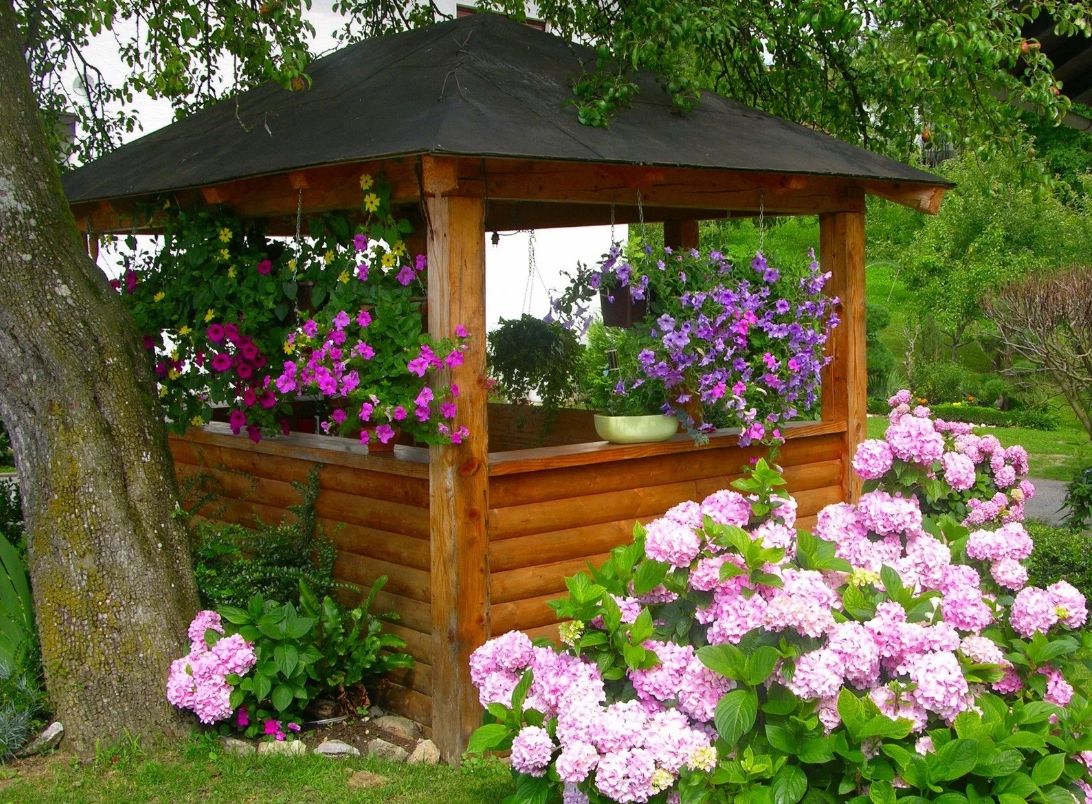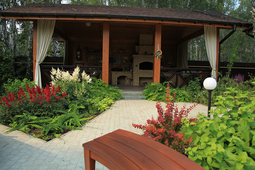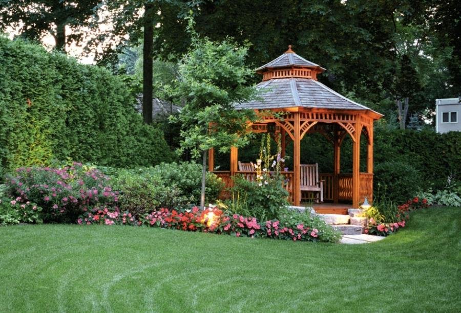 - Les aires de loisirs sont situées de différentes manières. Les éléments peuvent être en un seul endroit ou dispersés sur le périmètre. Le gazebo sera sauvé du soleil brûlant. Décorez la zone avec des parterres de fleurs, des sentiers bien aménagés, des arbustes, un étang, une fontaine ou construisez une piscine à proximité.