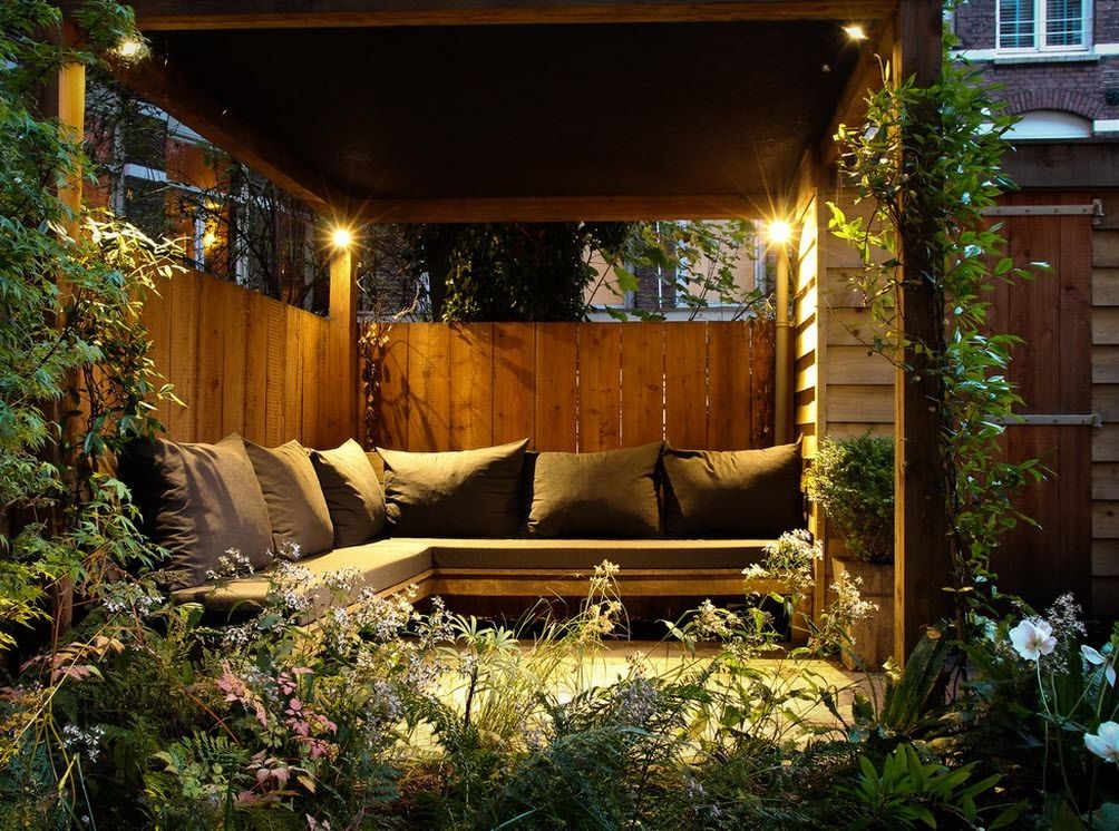 Les coins vides des clôtures entravent visuellement l'espace d'une petite zone. Placez en eux toutes les petites formes - une petite tonnelle, une pergola avec un banc ou un podium avec des fleurs