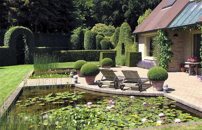Le relief s'adapte à plat, aligné. L'image du bâtiment, des passerelles, des lits géométriques. En se concentrant sur la croissance des cultures, ce sera l'option la plus économique. Le schéma de plantation d'arbres est divisé en échecs rectangulaires, carrés. Les ruelles sont simples. La construction implique une disposition harmonieuse des pièces par rapport à la structure principale, les éléments du paysage sont réalisés sous une forme stricte. Les allées, les allées sont des étangs rectangulaires clairs et réguliers.