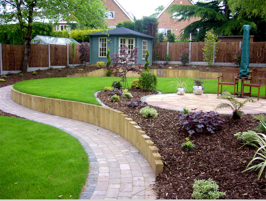 Parterres de fleurs le long d'un chemin de pierre menant à un belvédère confortable à l'arrière de la parcelle