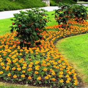 Les soucis dans le parterre de fleurs, comme sur la photo, sont entrés avec succès dans la conception du paysage, ont l'air merveilleux pendant une longue période - de juin au gel. Les graines donnent l'auto-ensemencement et germent sur 3-4 ans. Les tagètes doivent leur odeur épicée plutôt au feuillage - il sent plus fort que les bourgeons.