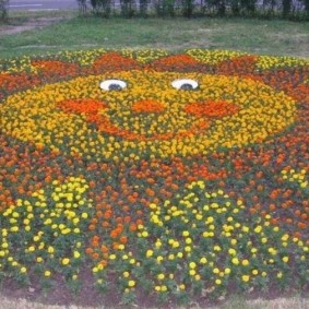Une composition composée de plusieurs parterres de fleurs semble spectaculaire, où chacun est ensemencé avec des plantes de la même espèce de la même couleur et de la même hauteur. Ils peuvent être disposés à la fois au même niveau et en cascade. Assurez-vous d'utiliser des soucis dans le jardin, les photos et la conception confirment la nécessité de leur utilisation pour créer une conception de paysage de toute complexité.