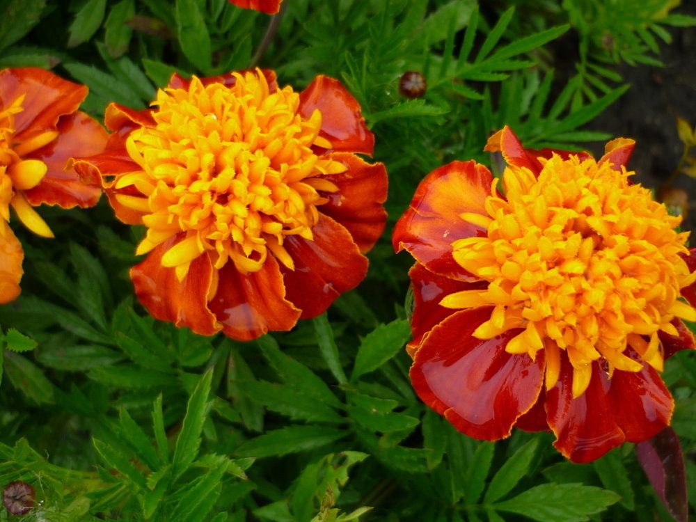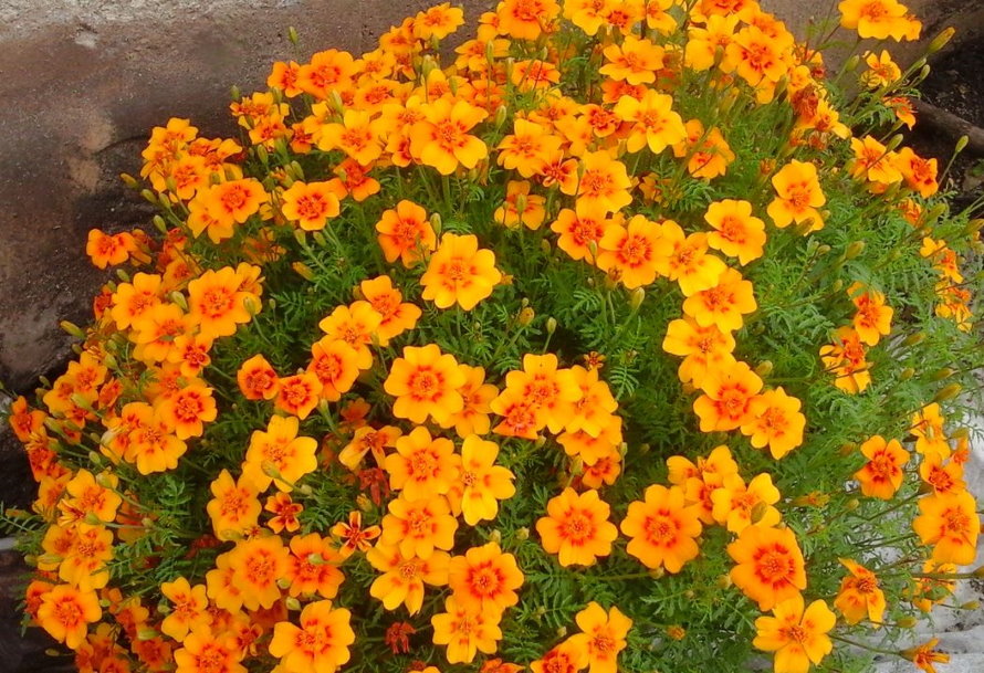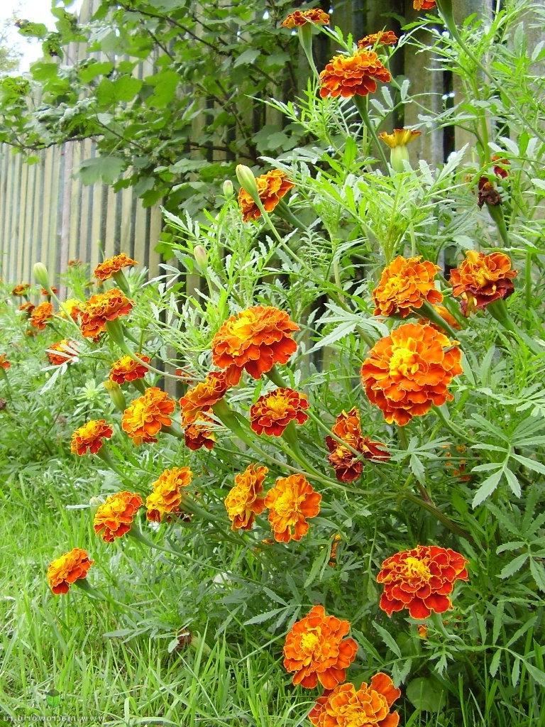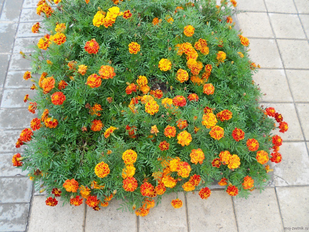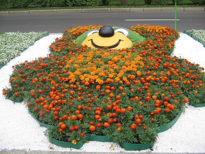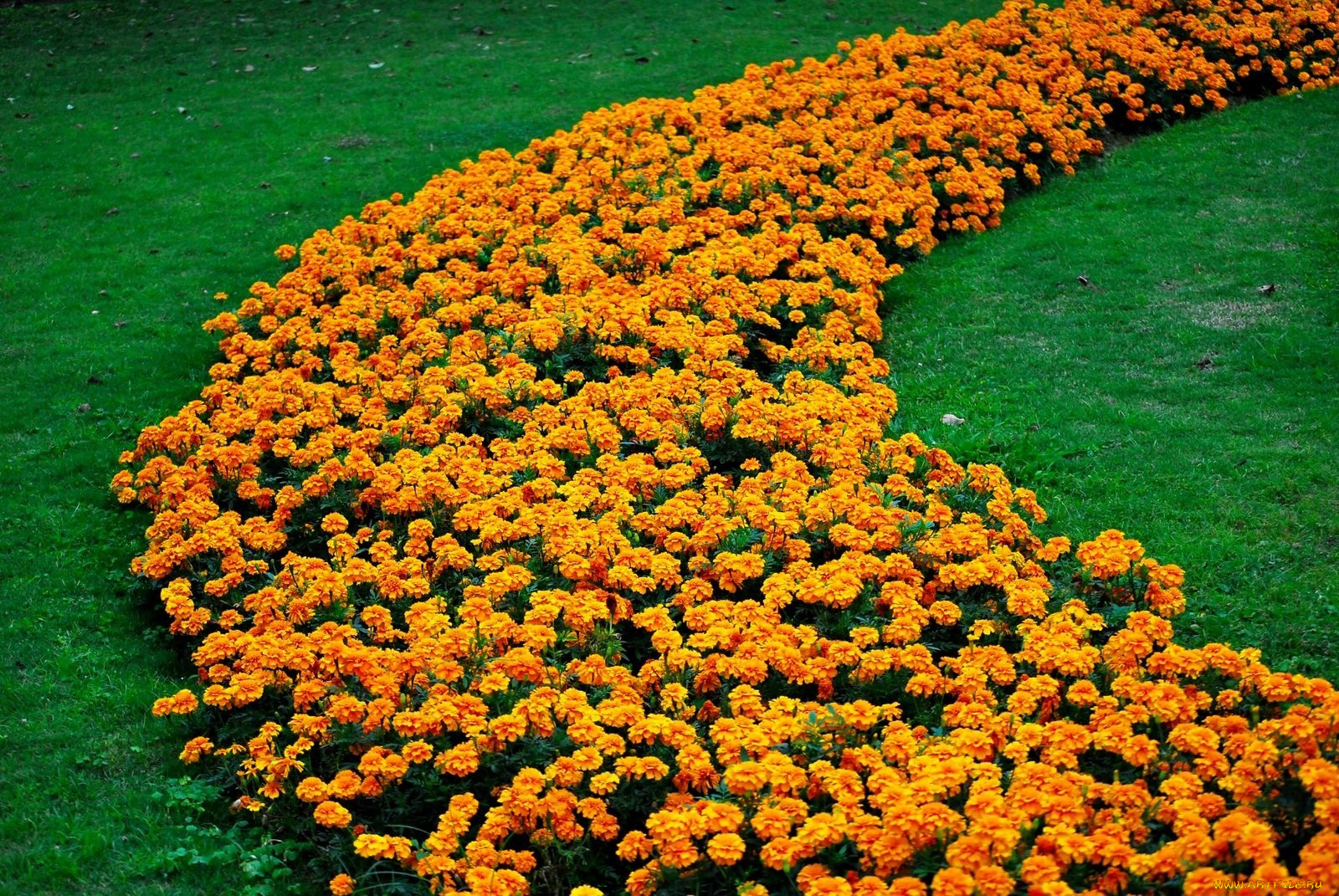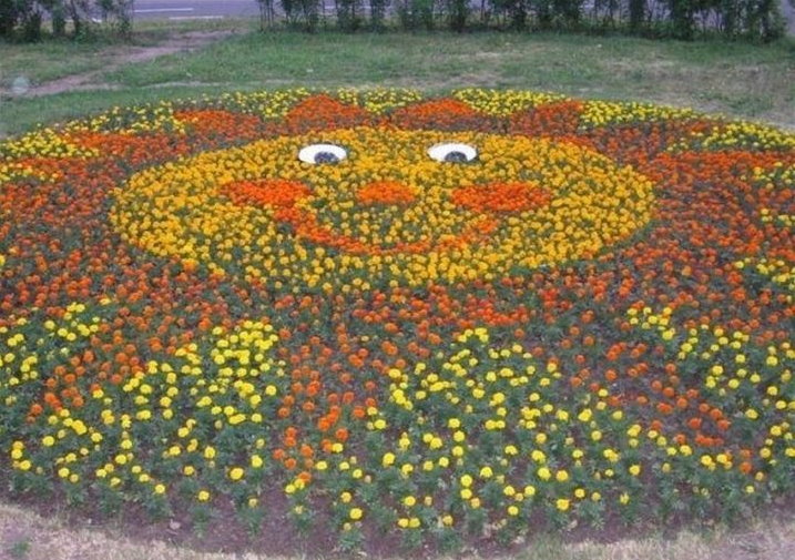 Les soucis dans le parterre de fleurs, comme sur la photo, sont entrés avec succès dans la conception du paysage, ont l'air merveilleux pendant une longue période - de juin au gel. Les graines donnent l'auto-ensemencement et germent sur 3-4 ans. Les tagètes doivent leur odeur épicée plutôt au feuillage - il sent plus fort que les bourgeons.