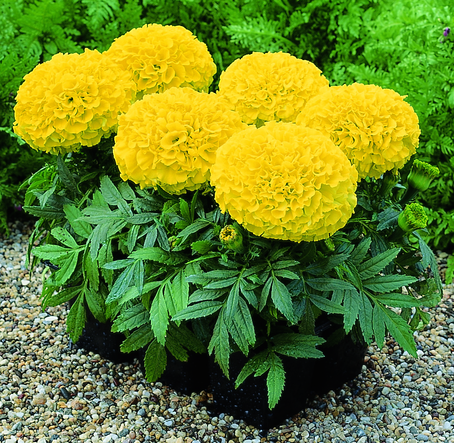 - Debout, appelé africain. Ce sont des arbustes de différentes branches, d'une hauteur de 40 à 110 cm, à feuilles dentées non appariées. Les pétales sont simples ou éponge, souvent monophoniques. Les inflorescences sont grandes, de 5 à 15 cm de diamètre. La vie des soucis dans le parterre de fleurs s'étend de juillet à la mi-automne.