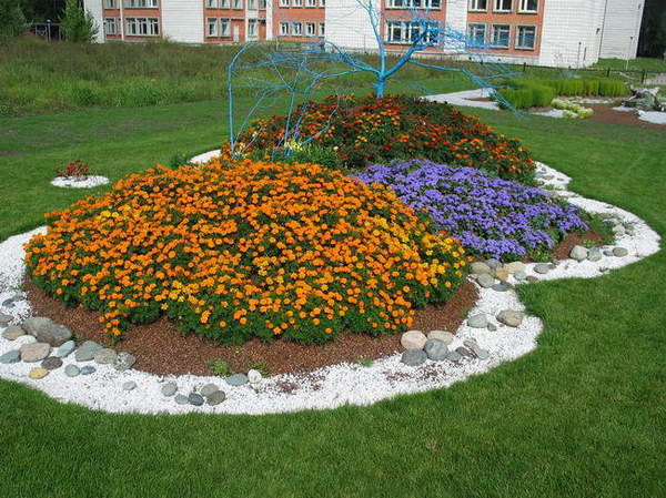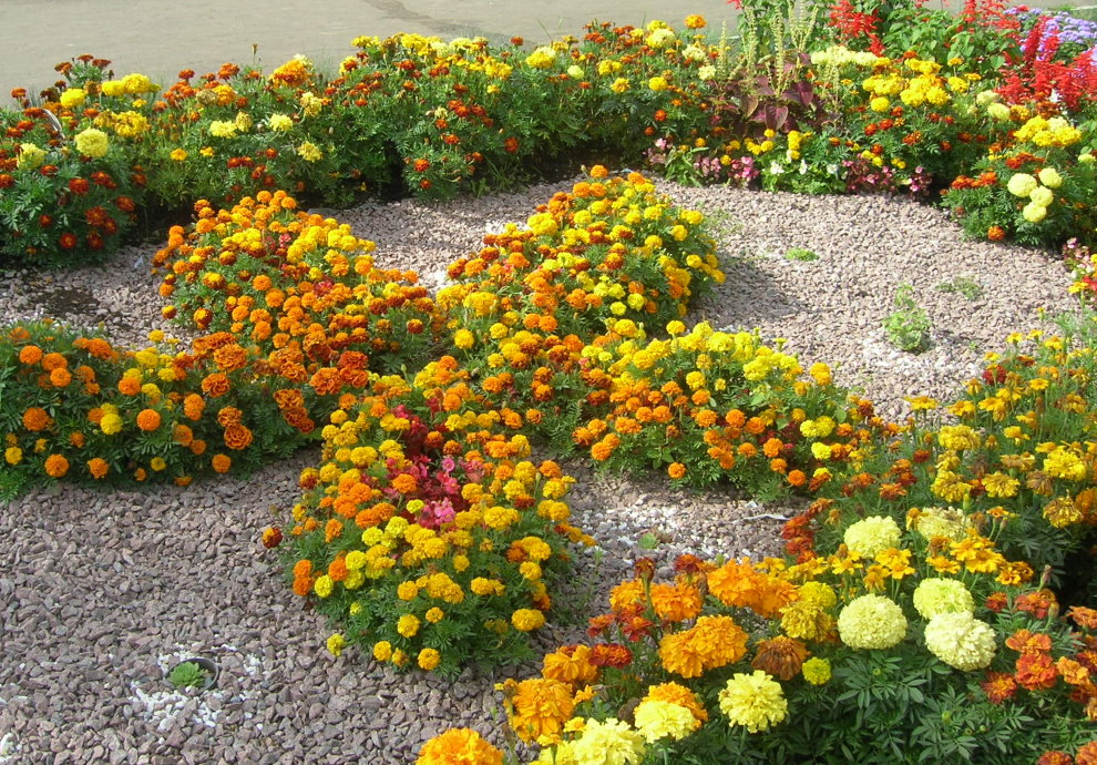 En utilisant des soucis de couleurs contrastées, vous pouvez créer divers motifs sur les parterres de fleurs