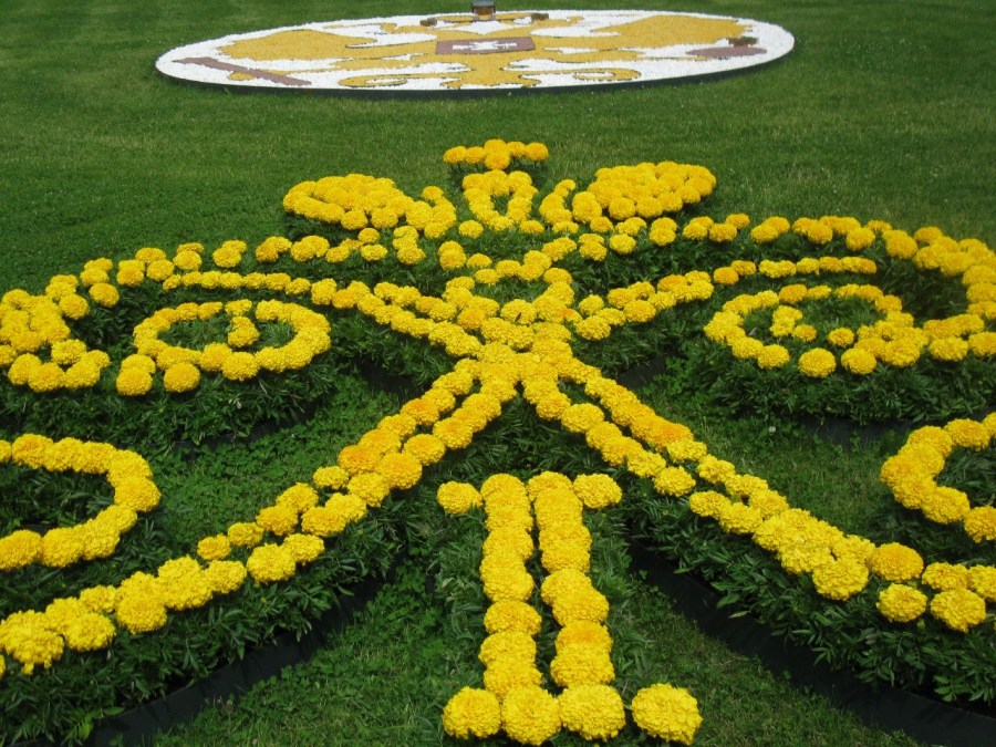 Il semble bien parterre de fleurs avec des anneaux de soucis et de pétunias, au centre desquels poussent des buissons verts de kokhei