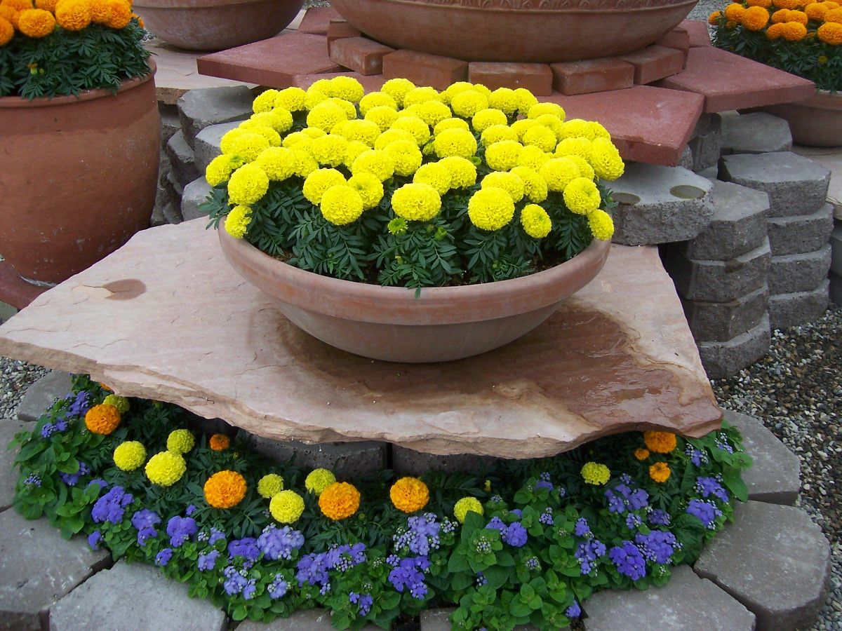 Les soucis se sentent bien dans des pots, des conteneurs ou des pots de fleurs en pierre