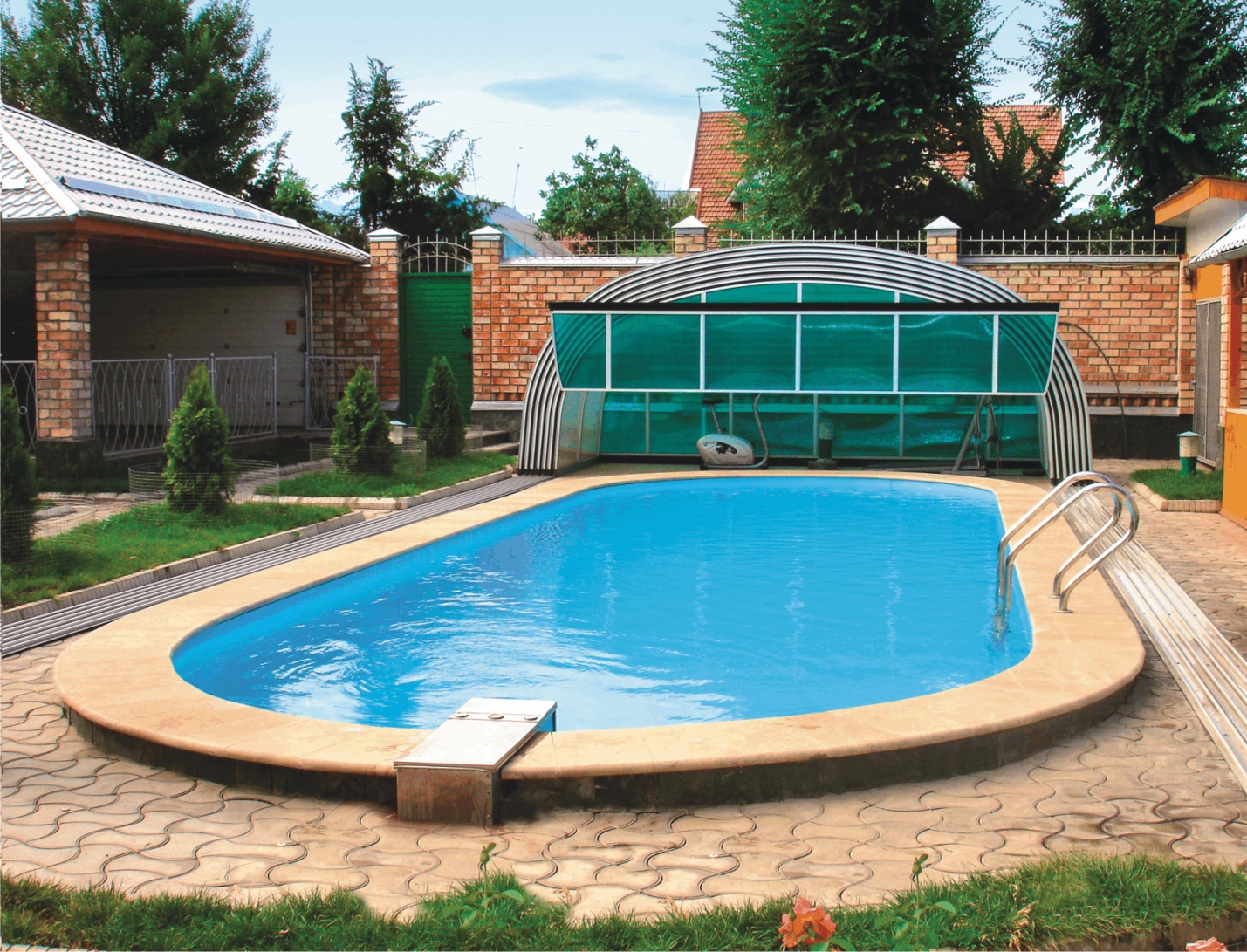 Pour équiper l'objet, des éléments structurels légers et des matériaux de différentes couleurs doivent être utilisés. Il vaut mieux refuser les fleurs foncées. La meilleure option pour le matériau de finition de l'intérieur de la piscine est la mosaïque bleue. Dans certains cas, l'objet peut avoir un toit rétractable.