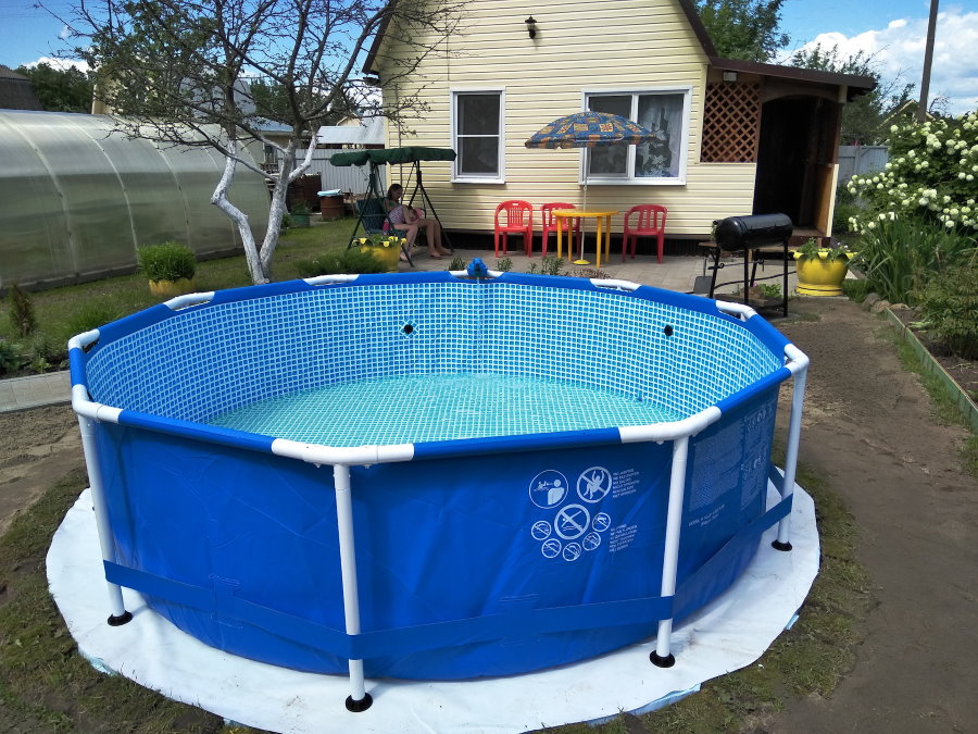 - Les objets gonflables à cadre ont un volume accru par rapport aux piscines gonflables simples. Avec cette conception, les côtés sont renforcés avec des éléments de cadre. Pour mettre une cour en forme de piscine, la plate-forme doit être nettoyée des objets tranchants et être de niveau.