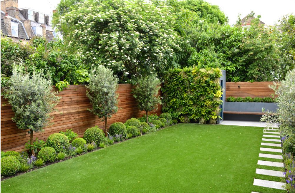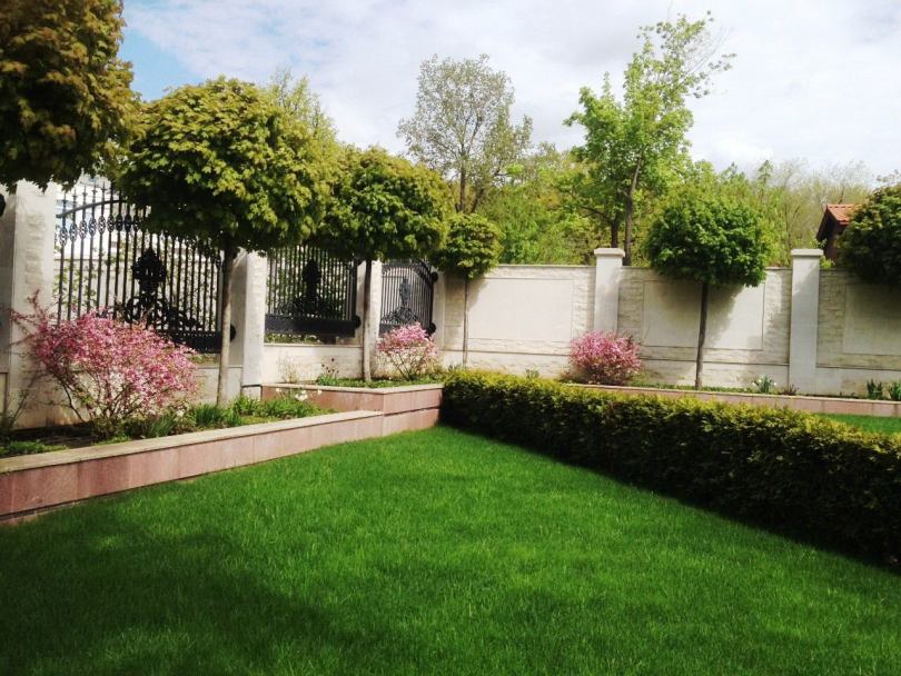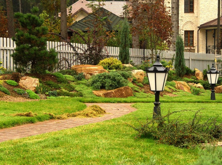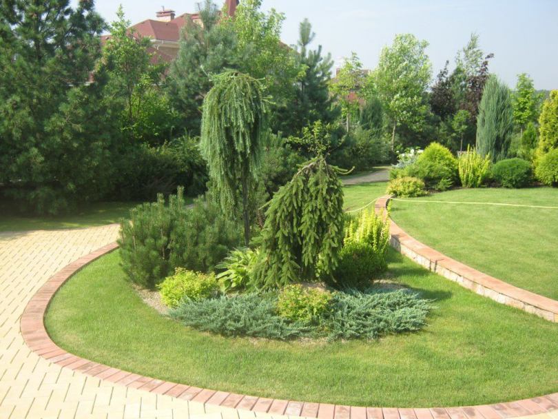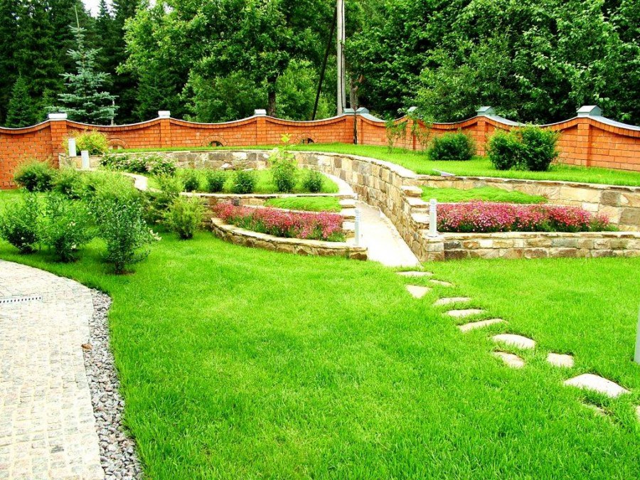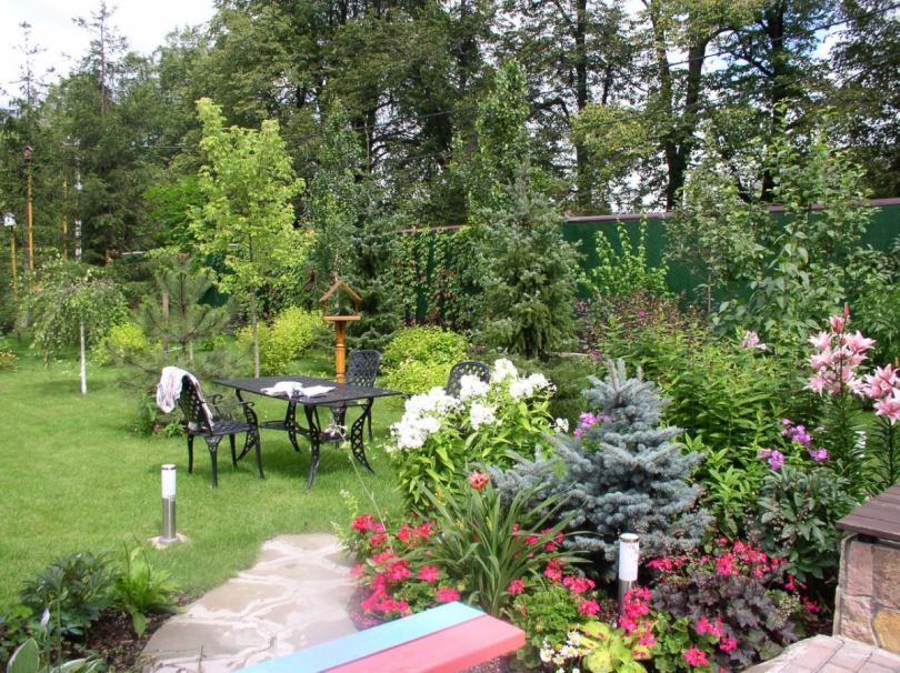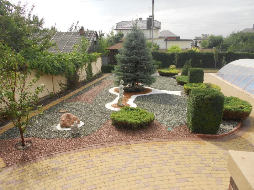 Parterres lumineux, rocailles pittoresques (parterres de pierres, gravier), collines alpines complètent la composition du territoire. Les arbres, les arbustes, les haies masquent les bâtiments de ferme, augmentent l'attrait esthétique de l'objet. Les tapis de pelouse créent l'effet du toilettage et complètent l'aménagement paysager.