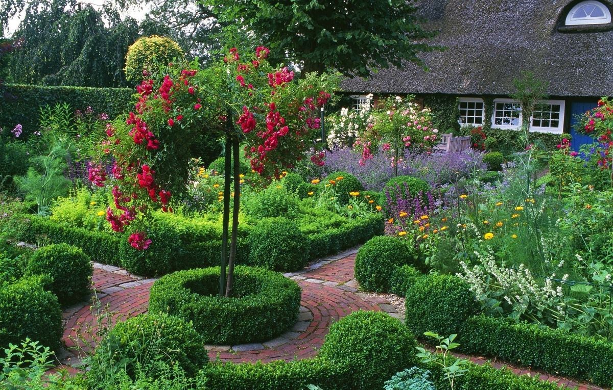 L'idée principale est que le jardin devrait ressembler à la nature elle-même, et non à une personne, par exemple, une clôture enroulée de plantes, un vieux banc d'arbre, des marguerites et des bleuets poussant près de la maison, les variétés de fleurs sauvages et simples sont très populaires .