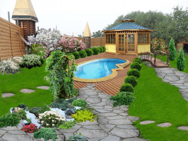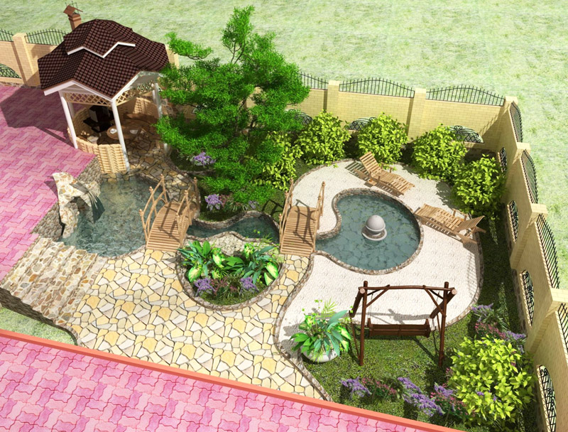 Les chemins dans un tel jardin sont tous arbitraires et ont des virages lisses, pas d'angles! Pour les chemins, du bois naturel ou des pavés sont utilisés.