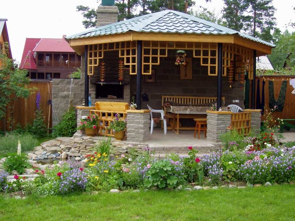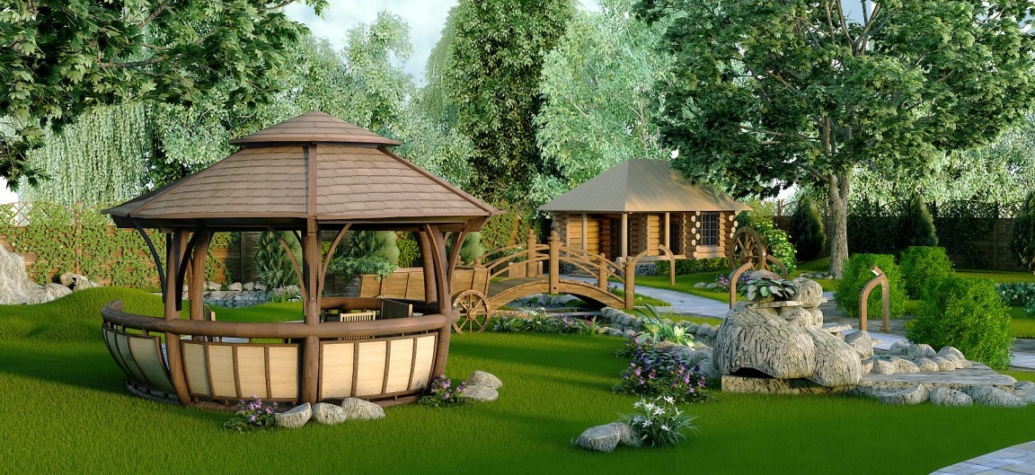 La maison devrait également être entrelacée de verdure et de fleurs (le parement sous un arbre est très populaire aujourd'hui). Les meubles (bancs, gazebo) pour le jardin peuvent être en bois. Le chêne, le cerisier, le bouleau et le tilleul dureront très longtemps. À partir de souches, vous pouvez faire une table.