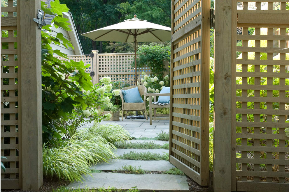 La clôture "treillis" est un rail monté sur le châssis à une distance égale à un angle de 90 degrés les uns par rapport aux autres. Ainsi, une grille nette de carrés est obtenue. Le modèle le plus fréquent et le plus beau est les lattes fixées à un angle de 45 degrés par rapport au sol. Ce type de clôture en bois est plus difficile à monter et nécessite plus de persévérance que les lattes fixées en parallèle et à 90 degrés par rapport au sol. Le «treillis» de clôture sert à concevoir des tonnelles, des aires pour enfants et des aires de loisirs. Il se marie bien avec un décor vert: plantes grimpantes et pots de fleurs.