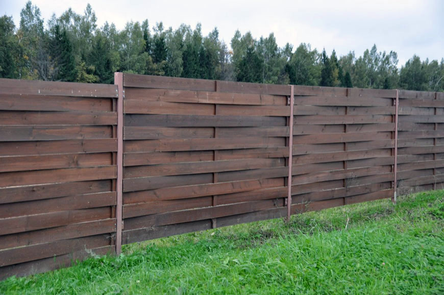 Une autre variante des "échecs" est horizontale. Dans celui-ci, le matériau en bande est situé horizontalement et les rails de guidage sont respectivement verticaux. Habituellement, une telle clôture en bois est solide, sans lacunes.