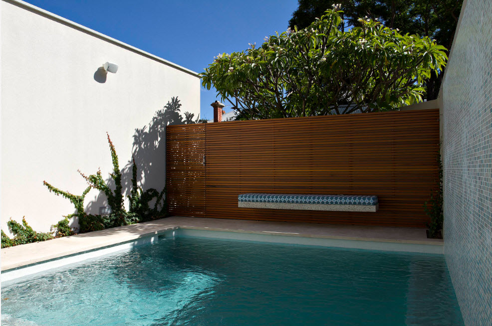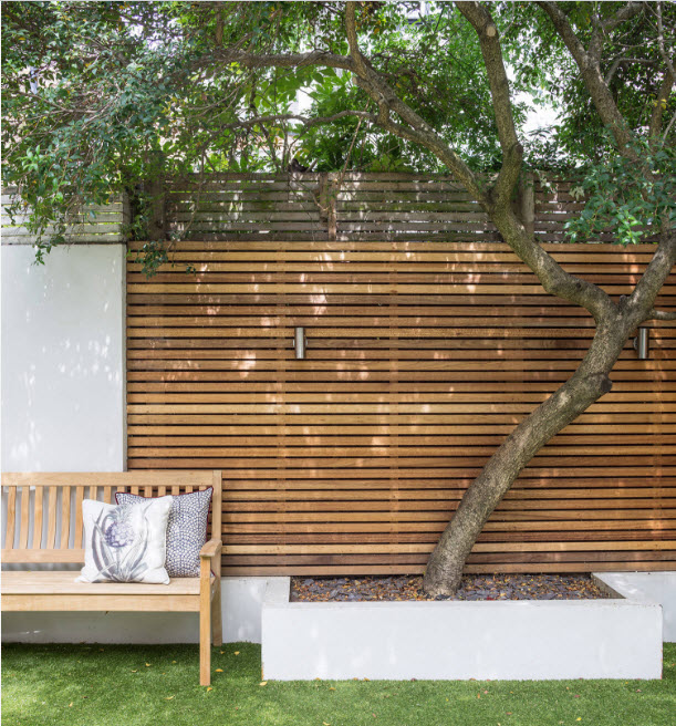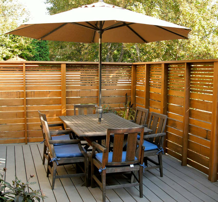 Il existe deux avantages d'une telle clôture en bois: une apparence belle et inhabituelle et une facilité d'utilisation pour une clôture extérieure. D'une part, il s'avère continu pour un look et ferme complètement la revue.D'autre part, en raison des entrefers, la haie a moins de vent, lorsqu'elle est installée en place avec des vents forts, cela peut être important. Il n'y a qu'un seul inconvénient dans cette clôture - la complexité de l'installation.