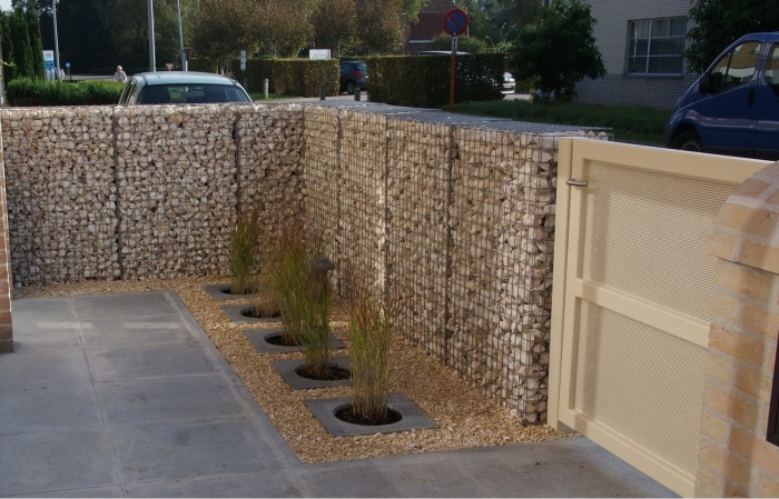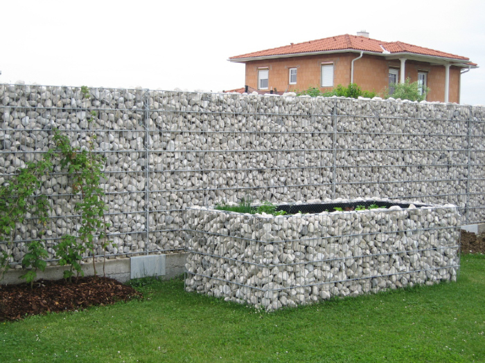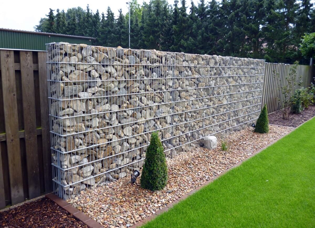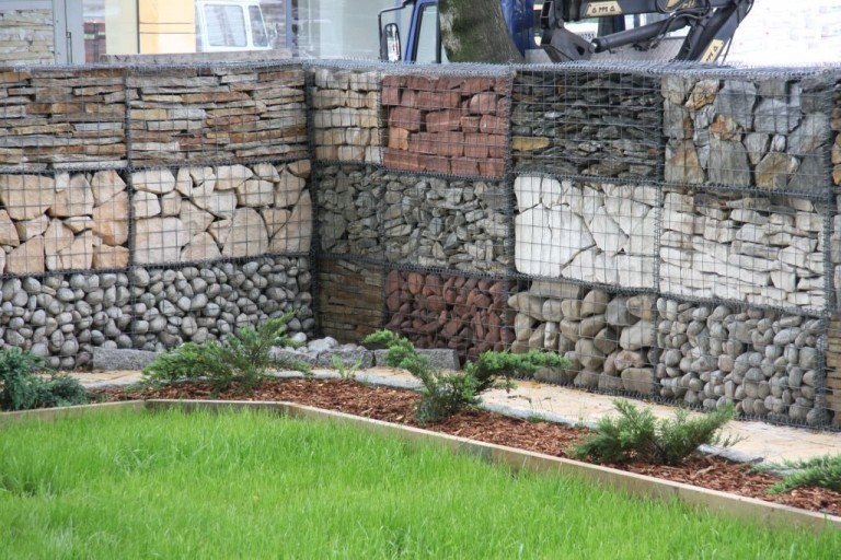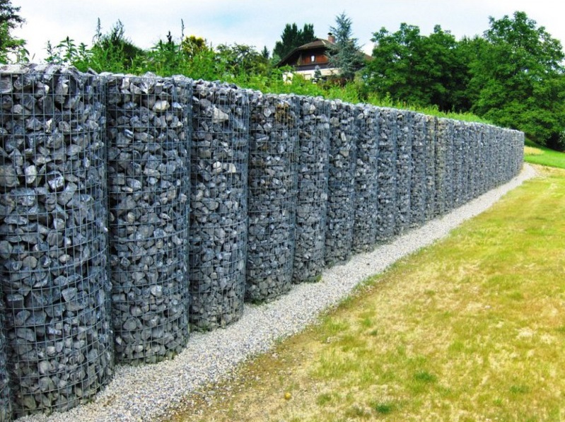 Le gabion se compose de deux rangées de treillis métallique galvanisé, dont l'espace entre est rempli de pierres, de galets et de gravier. Le plus souvent, des appareils montés sur boîte avec un dessus sont construits. Ces produits conviennent non seulement à la création de clôtures, de "labyrinthes" de jardin, de sculptures volumiques, mais également au renforcement de parties de la zone inclinée, à la réduction de l'érosion des sols, au renforcement des berges des plans d'eau.