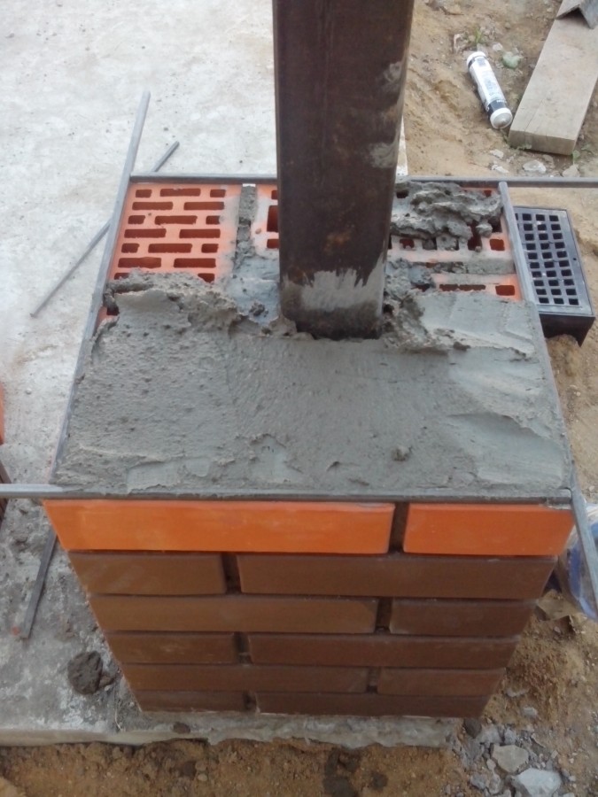 Pour maintenir une distance (couture) de 1 cm entre la maçonnerie, un niveau doit être utilisé pour le contrôle. Lors de la pose de briques, pour la stabilité de la structure, les plaques métalliques doivent être soudées à égale distance. Le tube profilé creux doit également être rempli de mortier de ciment.