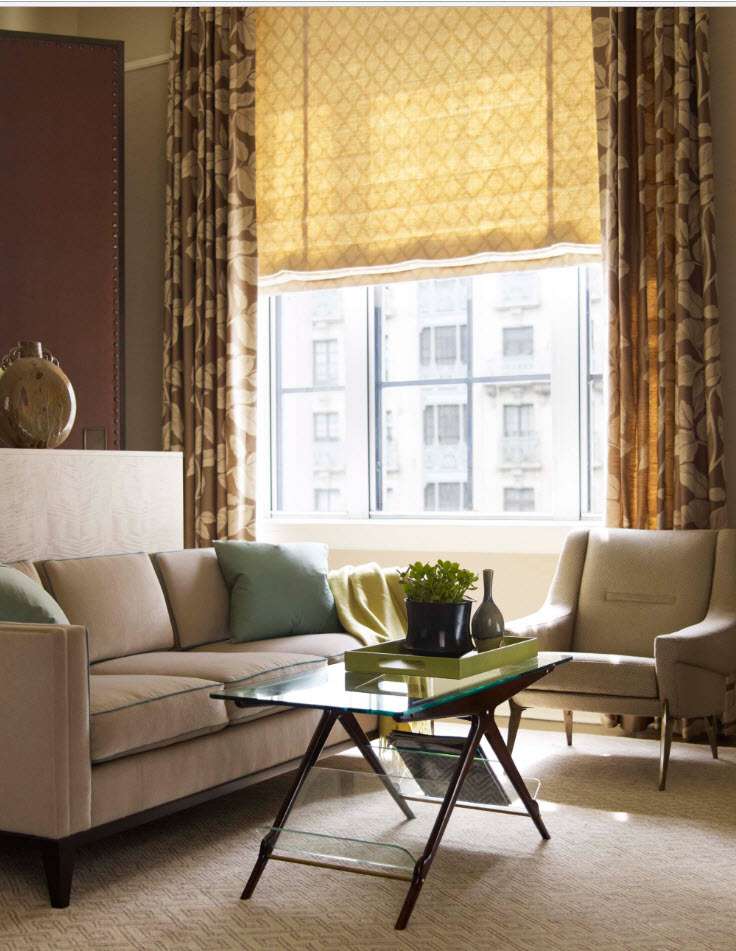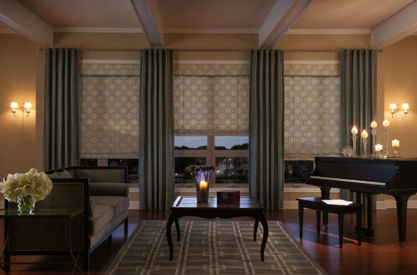Dalam projek reka bentuk moden ruang tamu, tirai tradisional sering dilengkapi dengan sarung tangan model lain - Rom, digulung, dengan tirai.