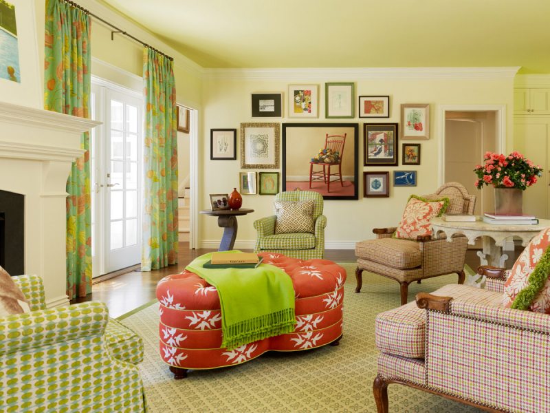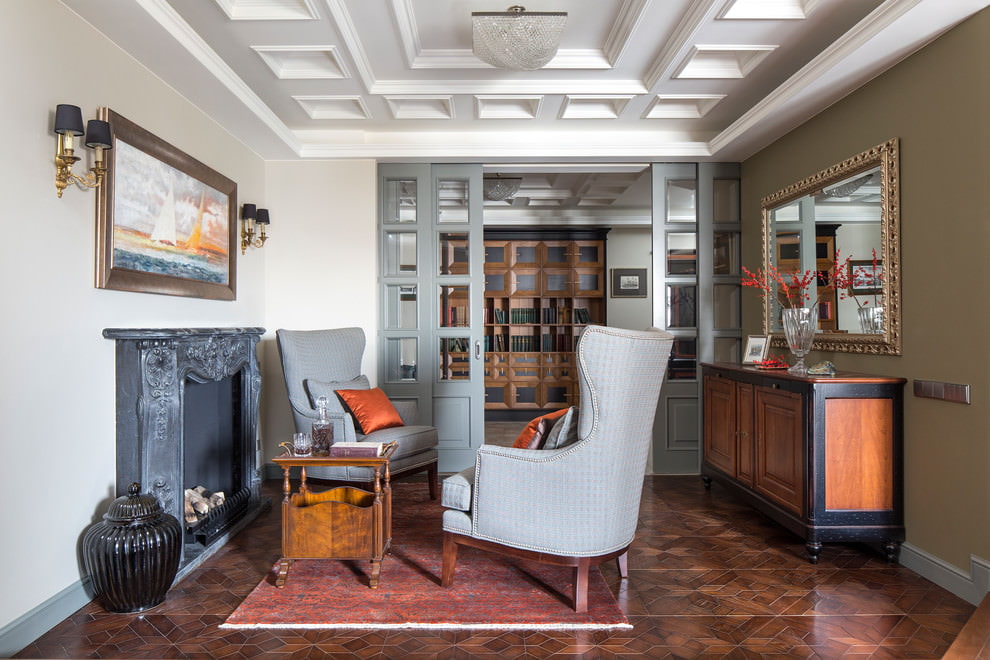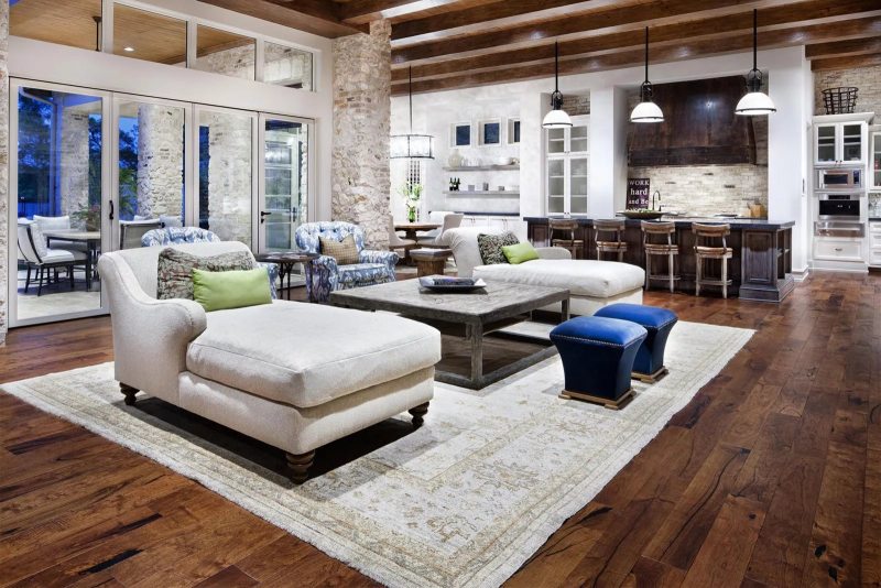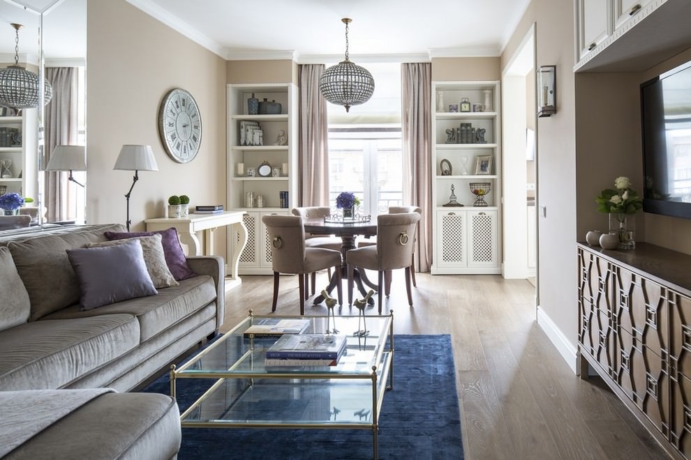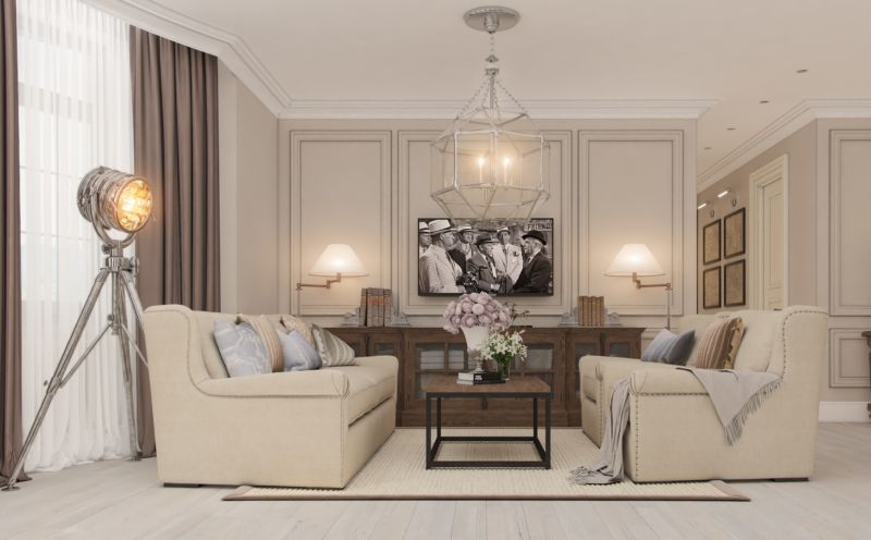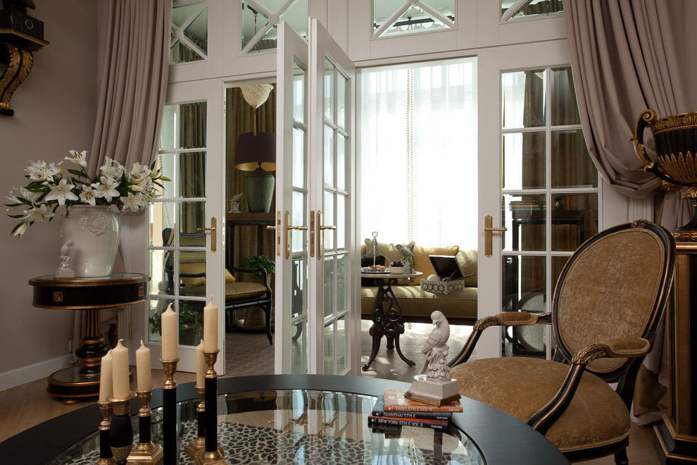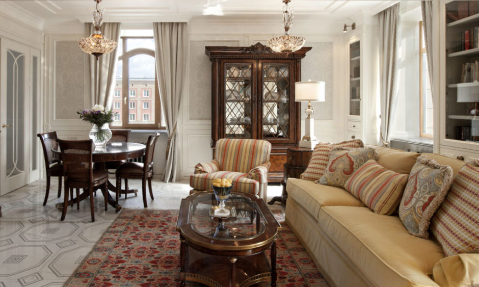 - Perabot diberi keutamaan yang lebih tinggi. Di dalam bilik anda tidak akan menemui satu sofa atau sepasang kerusi berlengan. Ia sentiasa "detasmen perabot" yang terdiri daripada beberapa kerusi, meja, sofa. Dan kehadiran ottomans untuk kaki dan meja kopi adalah wajib, yang menambah keselesaan ke bilik.