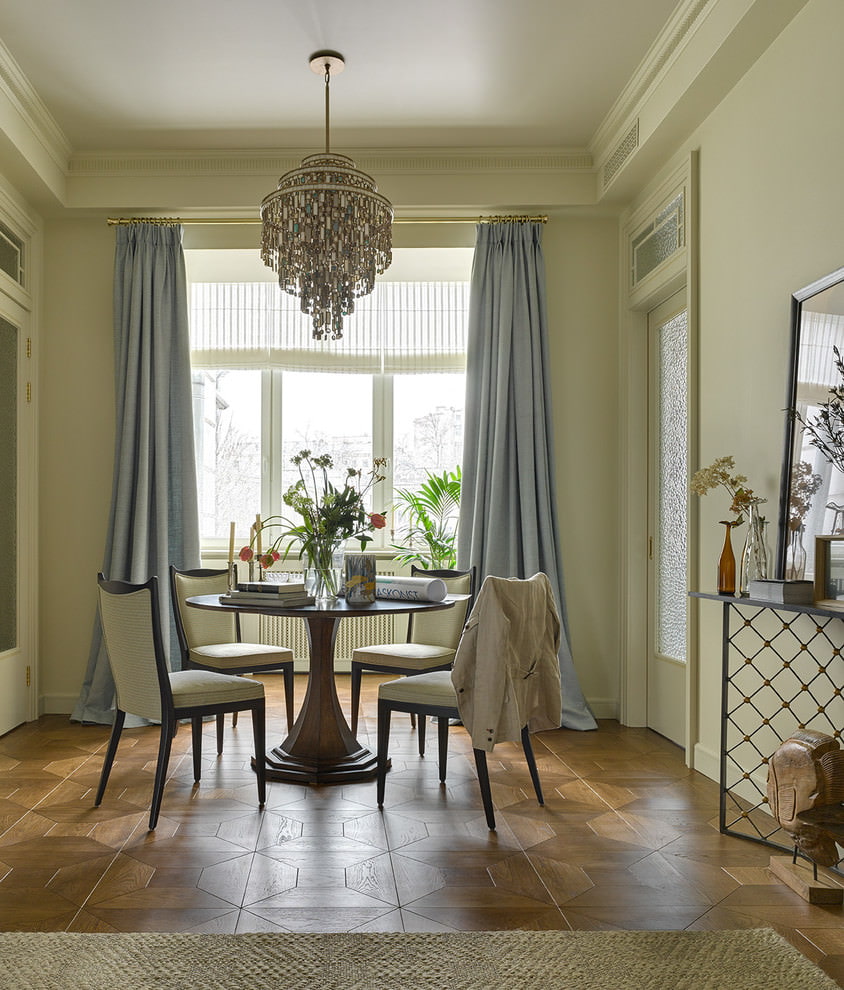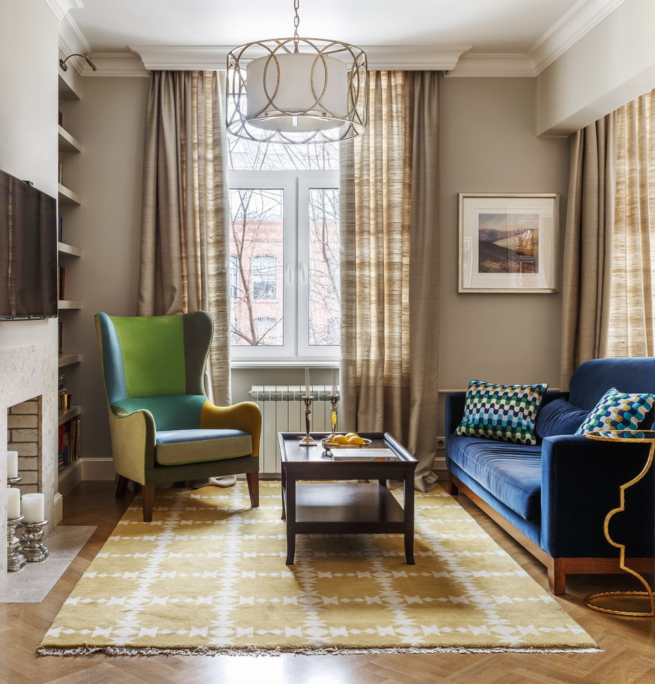 Perabot penting, simetri, kerusi mudah, tirai klasik.