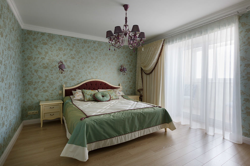 Bilik tidur menumpukan pada sebuah kandil besar. Corak, hiasan dan tambahan tali pinggang akan memberi penekanan lebih kepada keramahan pemilik rumah. Terdapat elemen sedemikian di setiap apartmen Amerika dan anda tidak boleh ketinggalan apabila anda mengikuti gaya ini.