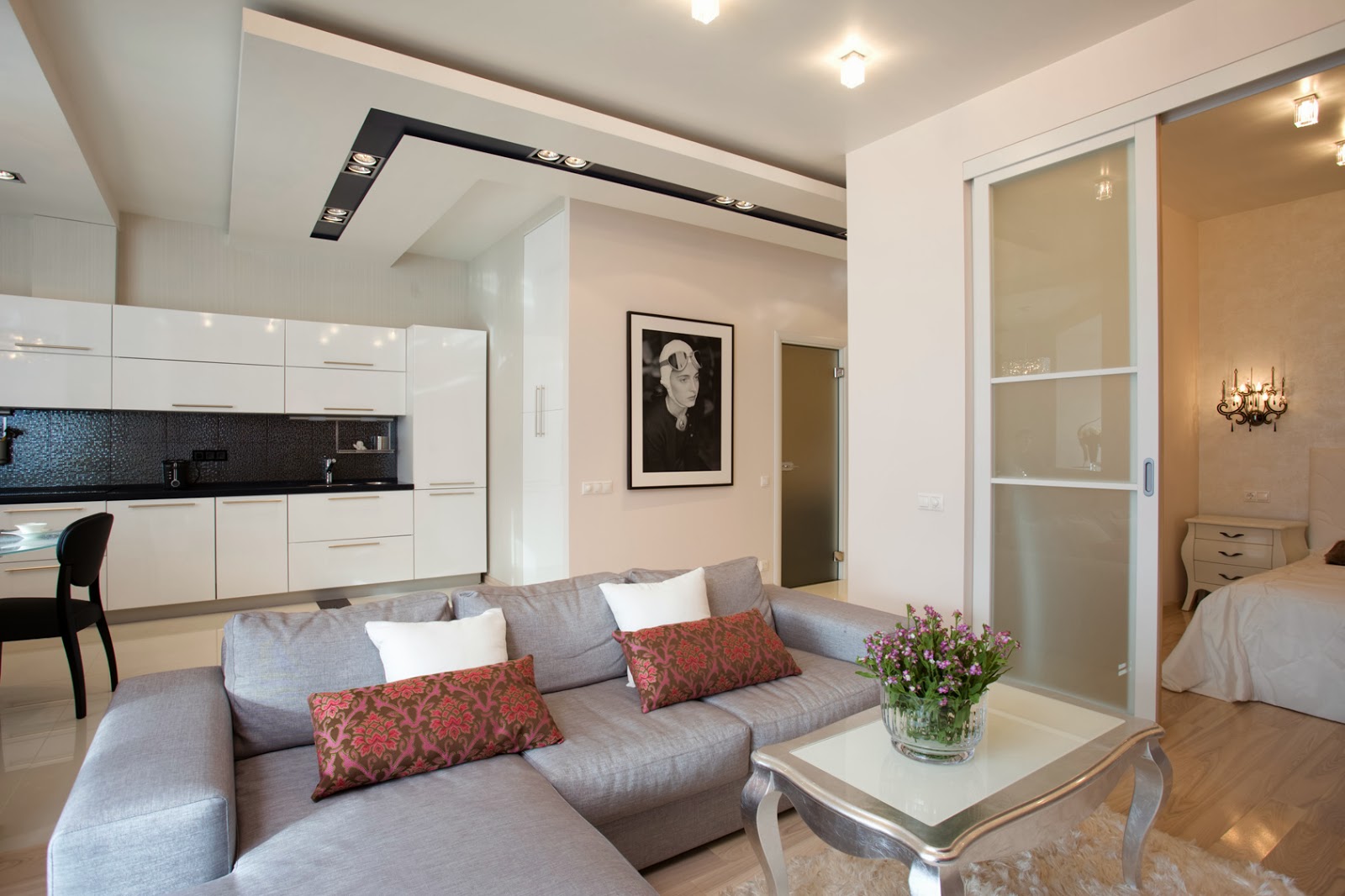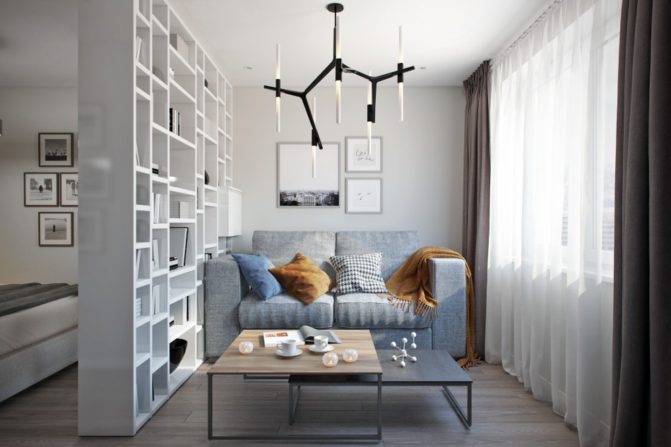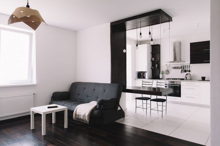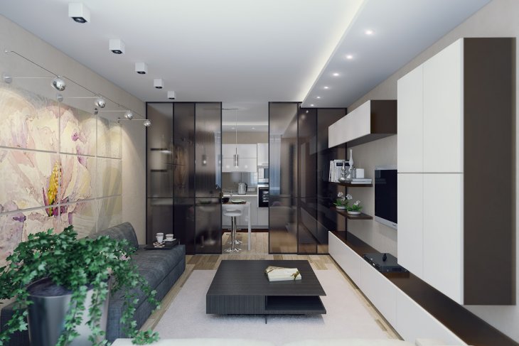 "Odnushka" yang luas dizonkan dengan podium dan perbezaan ketinggian siling, perabot dan warna dinding, skrin gelongsor dan tirai tekstil. Adalah lebih mudah untuk membuat semula apartmen satu bilik menjadi sebuah apartmen studio yang lengkap, kerana ia perlu untuk menghapuskan minimum dari halangan.