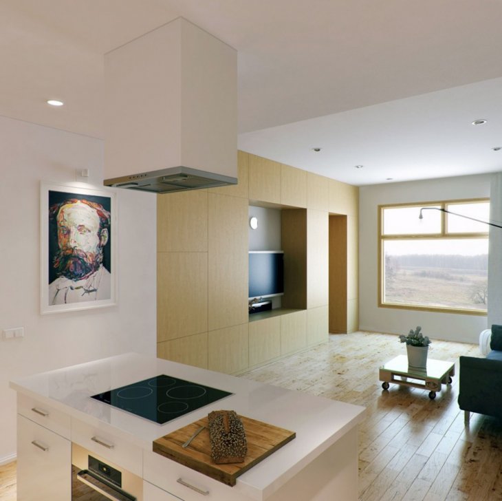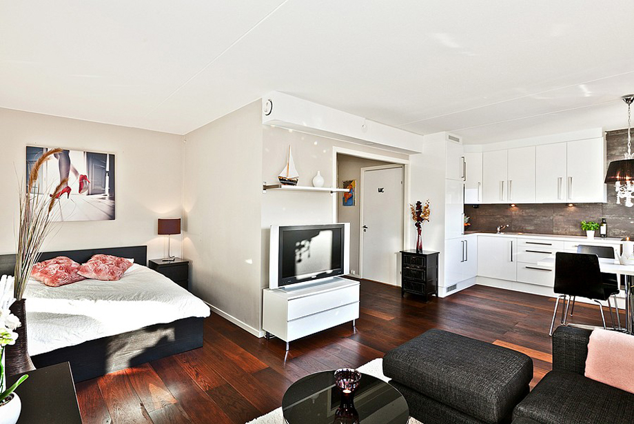 Penyewa hanya akan menyukai sebuah studio yang luas. Tetapi tidak setiap rumah boleh ditukar ke dalamnya, kerana kehadiran dinding dalaman, yang benar-benar tidak dapat diterima dihancurkan. Mudah untuk melengkapkan di sini bukan sahaja tempat tidur dan kawasan penerimaan, tetapi juga kajian, bilik persalinan, sudut sukan.
