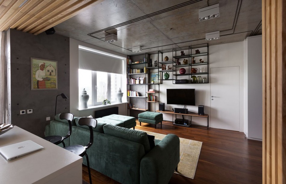 Rak dibida digunakan untuk menghiasi ruang tamu ini dengan gaya moden.