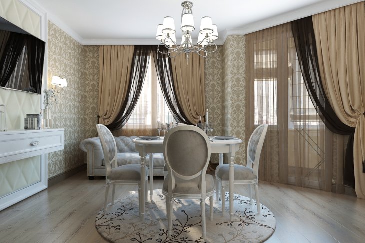 - Klasik Klasik abadi masih popular. Ini adalah pokok semulajadi dan fabrik mewah, corak bunga yang rumit pada kertas dinding dan candelier berat di tengah siling. Ciri tersendiri gaya ialah susunan perabot simetri, tempat letak hiasan yang sama. Bahagian pedalaman akan dilengkapi dengan lukisan dan cermin di bingkai yang diukir, pseudo-fireplace yang dihiasi dengan plaster, stucco plastik.