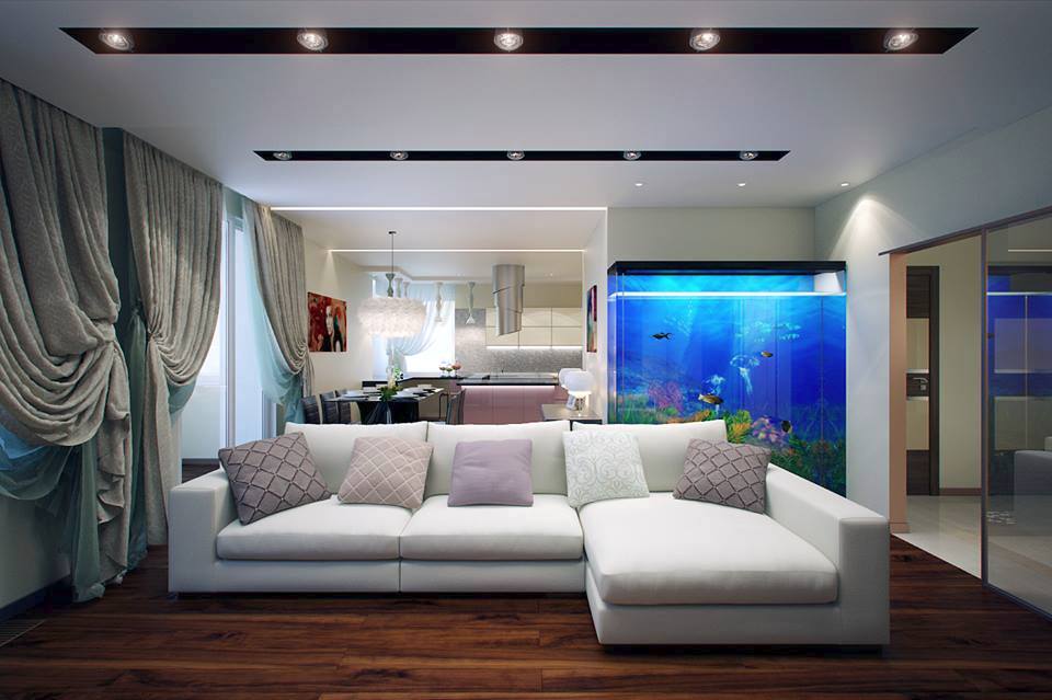 - Reka bentuk indah ruang tamu dengan akuarium yang akan menghiasi secara visual dan meningkatkan jumlah ruang;