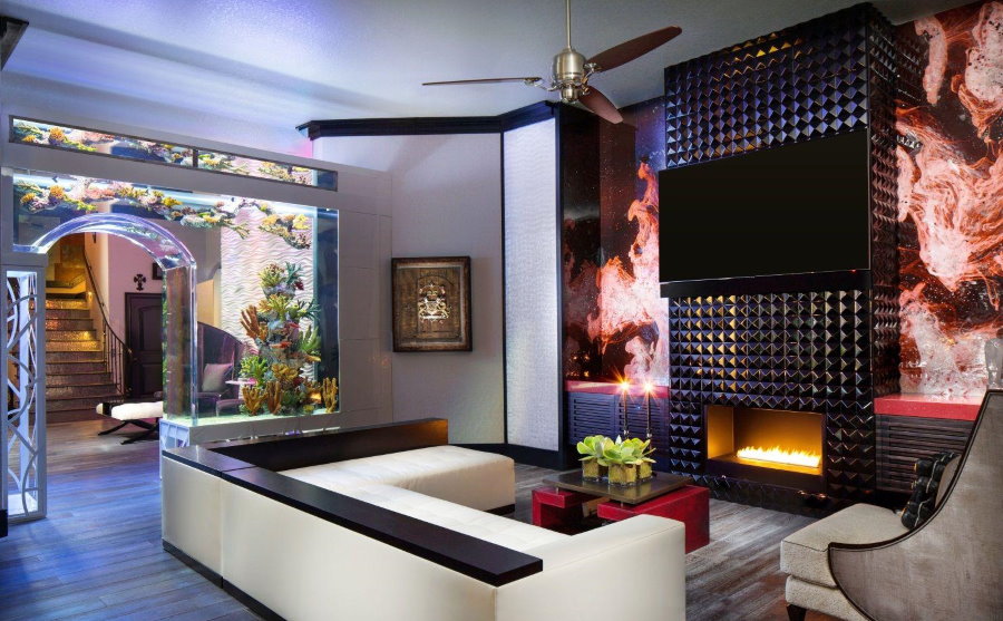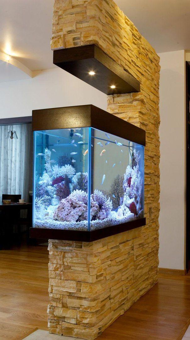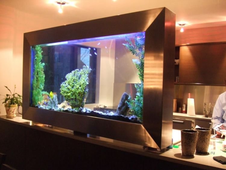 Ia adalah akuarium yang berfungsi sebagai pembahagi ruang. Terima kasih kepada kapal yang telus, bilik tidak kehilangan kelantangannya, tetapi sebagai kelebihan, dua zon berasingan masih muncul.