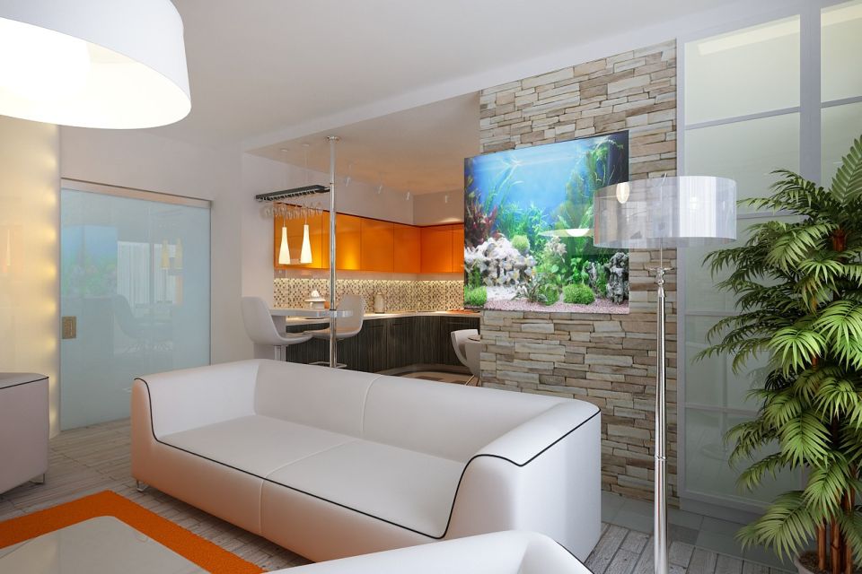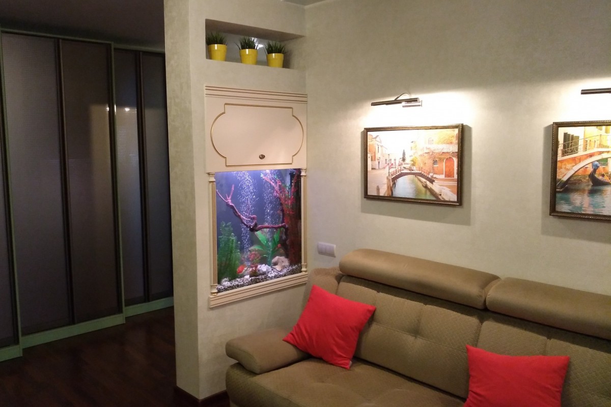 Foto idea-idea menarik untuk akuarium untuk ruang tamu di dinding antara bilik-bilik