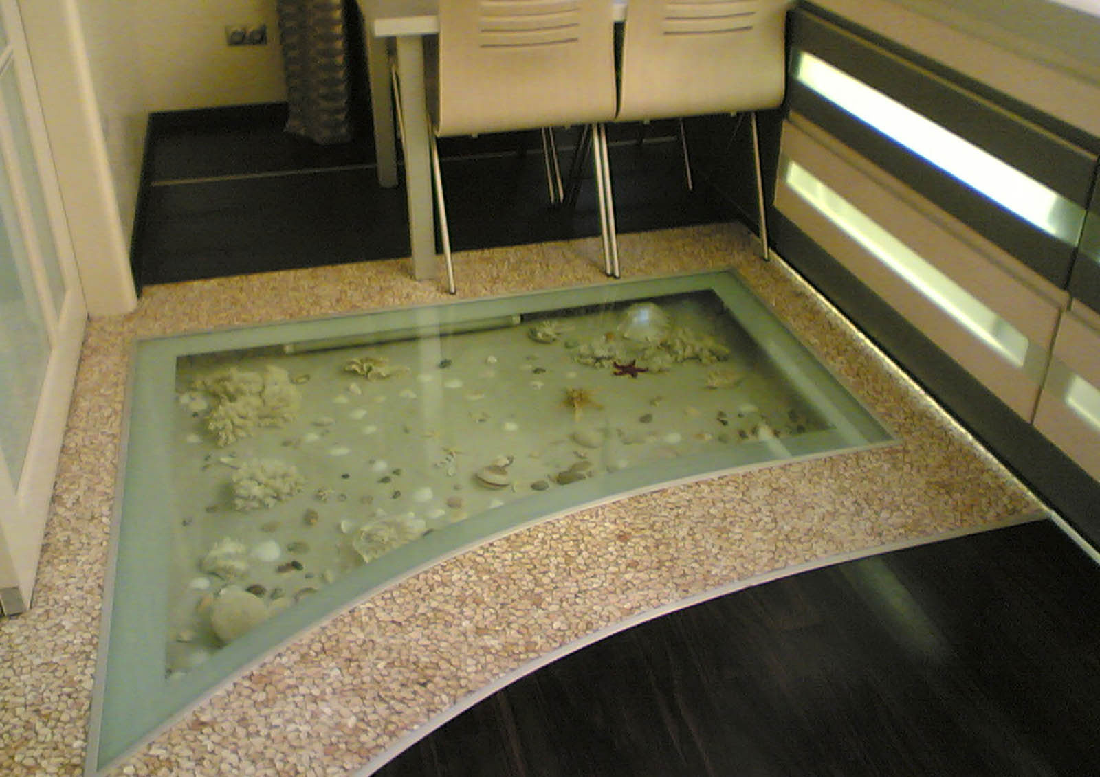 Akuarium di atas lantai adalah pembelian yang sangat mahal. Sebagai peraturan, ia tidak dipasang di bangunan pangsapuri, merujuk kepada ketebalan 30 sentimeter.