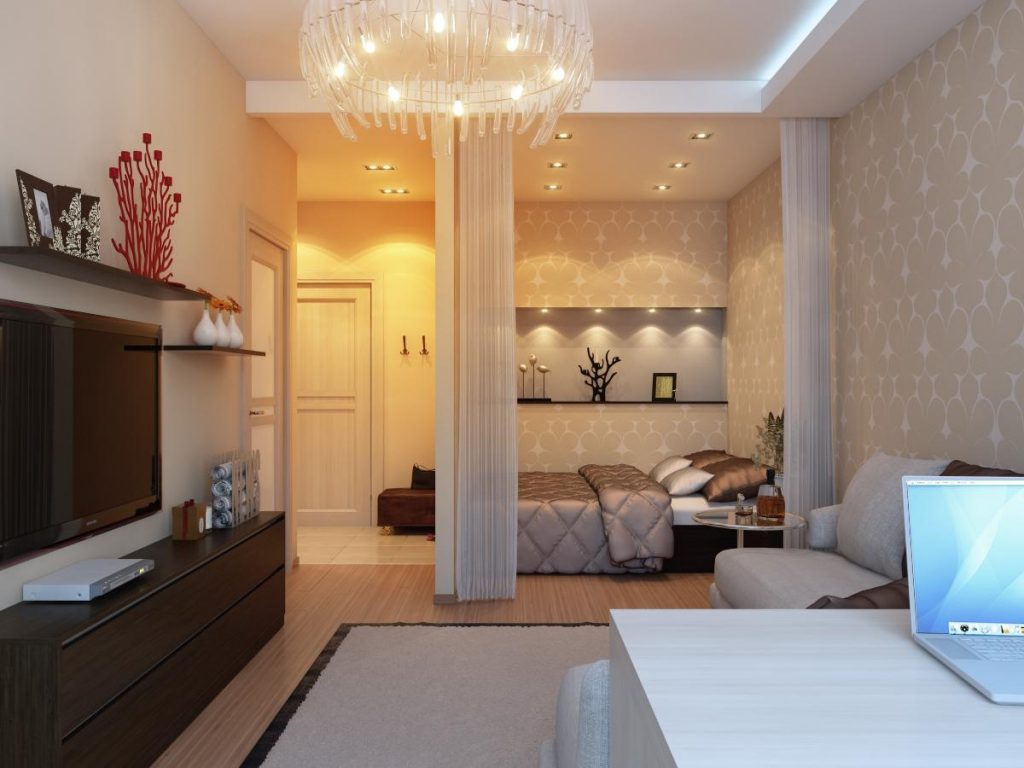 Jika dimensi apartmen tidak membolehkan anda mengatur tempat tidur yang berasingan untuk pemilik atau tetamu, anda boleh mengaturkan katil di ruang tamu.