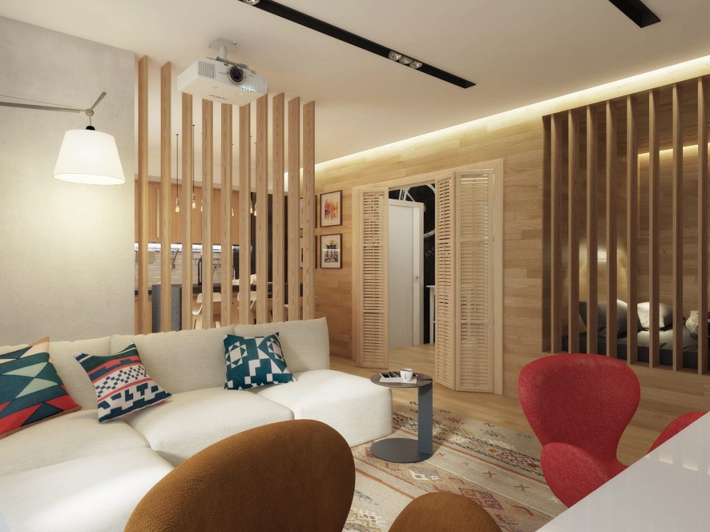 Kaedah utama zon ruang untuk lokasi sofa, tidur di apartmen studio